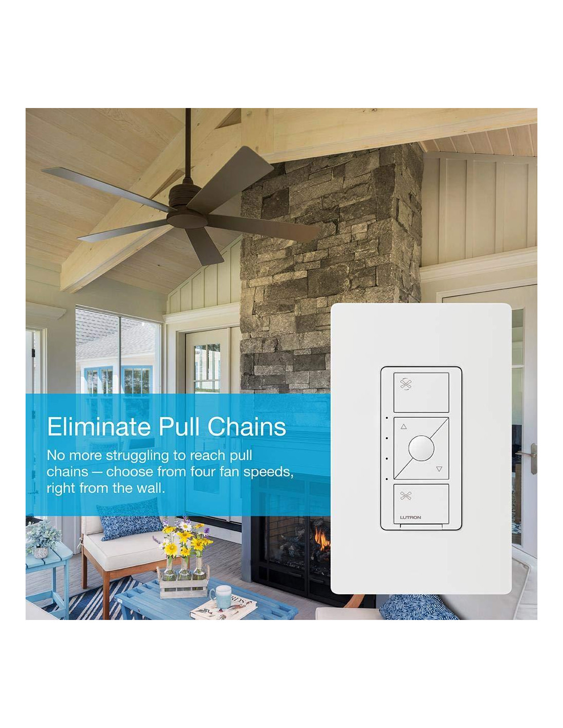 - CONTROL A TU MANERA: Caseta pone la inteligencia en el interruptor para que puedas controlar tu ventilador de techo a tu manera - a través de la aplicación, con tu voz, o desde la pared; crea horarios que configuren tu ventilador a una velocidad establecida o activa una escena con un botón (se requiere hub inteligente)