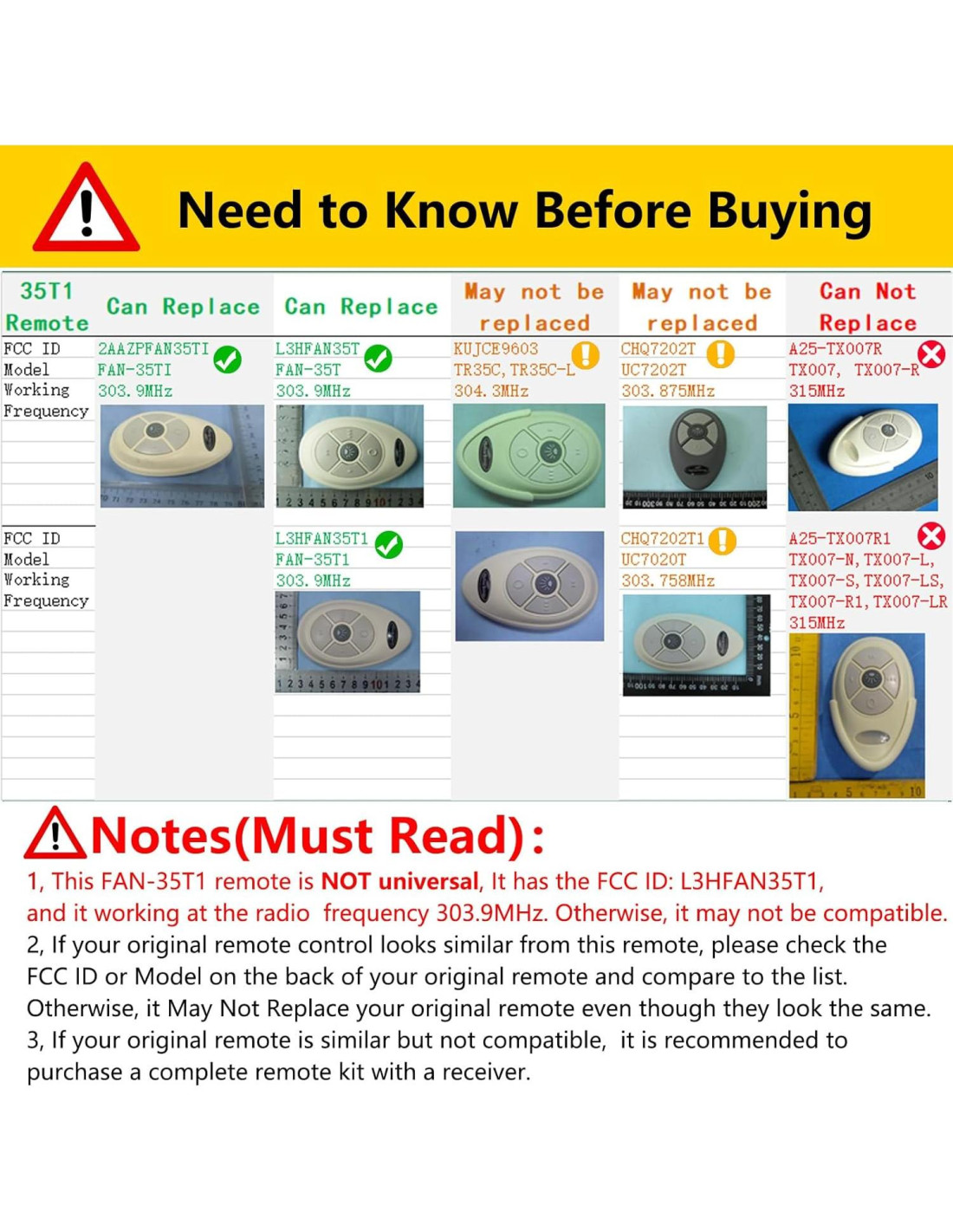 - {Lo que Necesita Saber Antes de Comprar} Este artículo NO incluye un receptor y una batería de 12V 'A23', es un control remoto de mano FAN-35T1 solamente, y funciona a una frecuencia de radio de 303.9MHz. Si su transmisor original se parece a este control remoto, verifique el número de parte de su control remoto original, debe tener uno de los números de FCCID/Modelo listados en la imagen, de lo contrario puede que no funcione. Si este artículo no funciona para usted, por favor compre un kit completo con un receptor en la tienda.