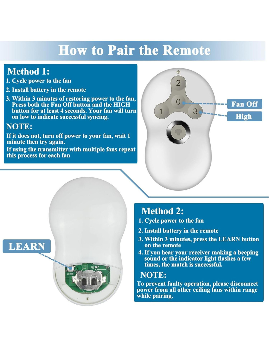 - Opciones de Emparejamiento Dual --- El emparejamiento es simple con dos métodos fáciles de usar: Presiona el botón APRENDER ubicado dentro del compartimento de la batería. Presiona simultáneamente los botones 0 + 3 en el teclado. Sin configuración compleja, tu ventilador se sincroniza rápidamente para un control instantáneo.