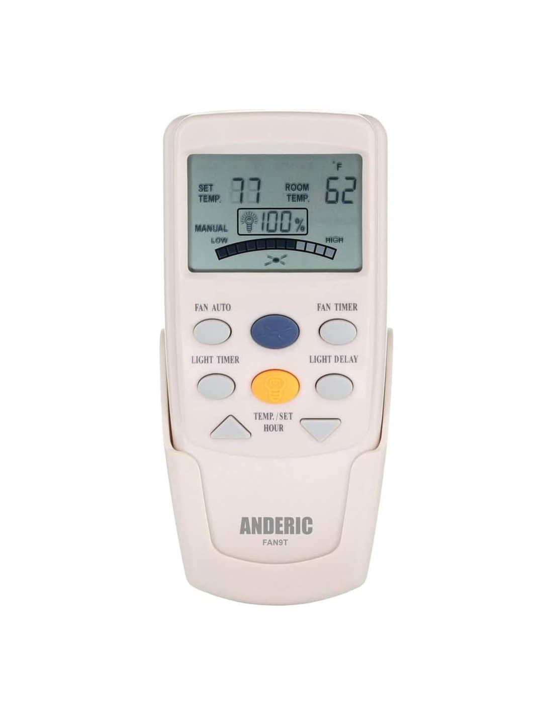 Anderic es una orgullosa empresa de Carolina del Norte, EE. UU. que proporciona controles remotos y accesorios de reemplazo de alta calidad. Anderic proporciona controles remotos de reemplazo para ventiladores de techo, controles remotos de TV, controles remotos de puertas de garaje, controles remotos de audio, controles remotos de hospitalidad, controles remotos universales, controles remotos de reproductores de streaming y otros accesorios de control remoto. Aseguramos que todos los controles remotos y accesorios Anderic tengan los más altos estándares de calidad. Somos una empresa de Carolina del Norte, EE. UU. En 1999, Dan's Electronics Etc., Inc. descubrió la necesidad de controles remotos de reemplazo y comenzó a fabricar con nuestra marca Anderic. Desde entonces, hemos expandido a cientos de modelos para elegir para una amplia variedad de dispositivos. Fuimos los primeros en fabricar controles remotos de reemplazo para controles remotos de marcas importantes descontinuadas. Intentamos extender la vida de su equipo con nuestros controles remotos de reemplazo de la más alta calidad. Presentamos el Control Remoto de Reemplazo Anderic FAN-9T con Tecla de Temporizador de Ventilador y Control Remoto Termostático para Ventiladores de Techo Hampton Bay. Mejore su experiencia con el ventilador de techo con este control remoto avanzado que brinda comodidad y funcionalidad mejorada al alcance de su mano. El control remoto Anderic FAN-9T está diseñado como un reemplazo para su control remoto original de Hampton Bay, ofreciendo una gama de características convenientes. Con la tecla de temporizador del ventilador, puede configurar fácilmente un temporizador para que su ventilador de techo se apague automáticamente después de un período específico, promoviendo la eficiencia energética y la comodidad. El control remoto también permite atenuar la luz, lo que le permite crear la atmósfera perfecta en su espacio. El control remoto FAN-9T incluye una función termostática, lo que le permite ajustar la configuración de temperatura de su ventilador de techo para mantener un ambiente cómodo. Simplemente establezca su temperatura deseada, y el control remoto regulará automáticamente la velocidad del ventilador para lograr y mantener la temperatura deseada. Para mantener su control remoto fácilmente accesible, el Anderic FAN-9T viene con un conveniente soporte de pared. Monte el soporte en un lugar adecuado, asegurando que su control remoto esté siempre al alcance cuando lo necesite, mientras también evita que se extravíe o se pierda. Para mayor comodidad, puede cambiar fácilmente entre las pantallas de temperatura en Celsius y Fahrenheit. Al mantener presionados los botones TEMP UP y TEMP DOWN simultáneamente durante 3 segundos, puede alternar entre las dos unidades de medida, lo que le permite personalizar la configuración de temperatura a su preferencia. El control remoto Anderic FAN-9T está diseñado específicamente para funcionar con ventiladores de techo Hampton Bay. Presenta FCC ID: L3HFAN9T y PN: FAN9T. Tenga en cuenta que este control remoto no admite la funcionalidad de reversa. Mejore el control de su ventilador de techo con el Control Remoto de Reemplazo Anderic FAN-9T con Tecla de Temporizador de Ventilador y Control Remoto Termostático. Disfrute de la comodidad del temporizador del ventilador, la atenuación de la luz y el control preciso de la temperatura, todo en un control remoto fácil de usar. Con el soporte de pared incluido, puede mantener su control remoto organizado y al alcance de la mano. Obtenga su control remoto Anderic FAN-9T hoy y experimente el siguiente nivel de comodidad y control para su ventilador de techo Hampton Bay. Un Número de Artículo: 1000 020 187, 458 633, 458 611, 458 301 Modelo: 26666, 26662, 26661, 26663 UL Modelo: 52-WWDIV