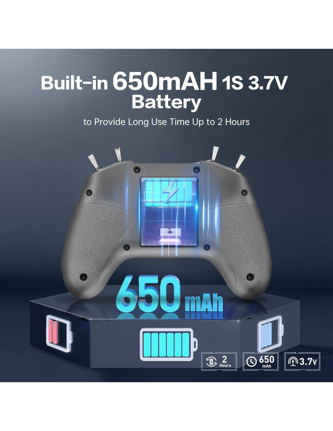 - Larga duración de la batería y operación segura: El Transmisor C8 ELRS (tu Controlador RC de referencia) tiene una batería incorporada de 650mAh (carga USB-C) para hasta 2 horas de uso, con advertencias de bajo consumo y apagado automático para proteger tu Drone FPV y controlador.