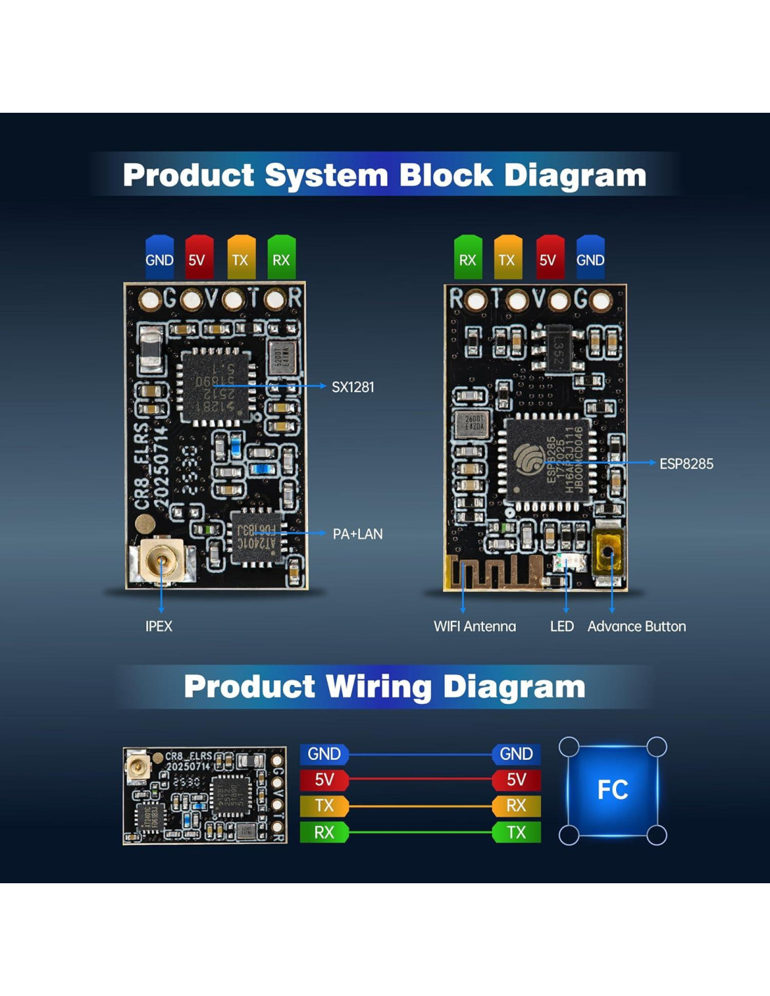- Sistema de control ELRS todo en uno: Este combo empareja el Transmisor C8 ELRS (un versátil Controlador Remoto FPV, Controlador RC y Controlador de Drones) con el Receptor CR8 ELRS, funcionando sin problemas como un conjunto de Módulo ELRS para preparar tu Drone FPV en poco tiempo.