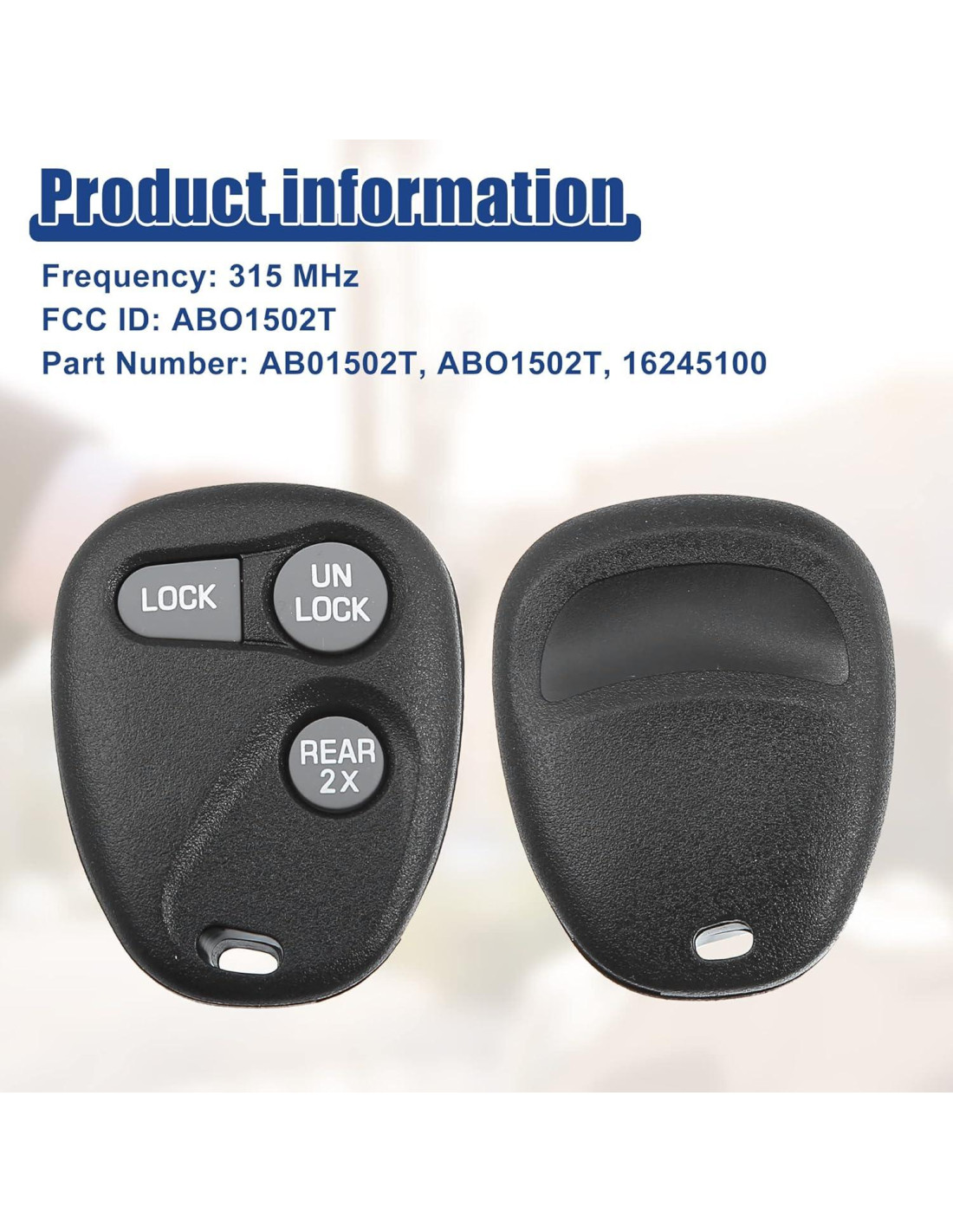 Características: Reemplace su control remoto de entrada sin llave roto con una pieza de repuesto adecuada. Reemplace su control remoto de entrada sin llave si está roto. Por ejemplo, el control remoto del automóvil no funciona. Instalación Fácil: 1. El control remoto debe ser programado y cortado por un cerrajero calificado o concesionario. 2. Asegúrese de que la programación del control remoto funcione antes de cortar la llave. 3. si tiene dificultades, consulte más información o video, no programe por su cuenta en ningún momento. La Batería y el Chip están incluidos. (La llave completa) ID de FCC: ABO1502T Número de Parte OE: AB01502T, ABO1502T, 16245100 Este es un producto no OEM, ¡accesorio SOLAMENTE! Especificación: Botón: 3 Frecuencia: 315 MHz Batería: Material: Plástico, Metal Color: Negro Tamaño: 5.4x4.2x1.4cm / 2.13''x1.65''x0.55''(L*W*H) Compatible con: para Chevrolet Astro 1997-1999 para Chevrolet Blazer 1997 para Chevrolet Camaro 1996-1999 para Chevrolet Cavalier 1997-1999 para Chevrolet Express 1500 2500 3500 1998-2002 para Chevrolet Malibu 1997-1999 para Chevrolet Monte Carlo 1997-1999 para Chevrolet Suburban 1500 1997-1999 para Chevrolet Tahoe 1997-2000 para GMC Jimmy 1997 para GMC Safari 1997-1999 para GMC Savana 1500 2500 3500 1998-2002 para GMC Yukon 1997-2000 para Pontiac Grand Am 1997-1998 para Pontiac Sunfire 1997-1999 Paquete Incluye: 2 pcs Control Remoto de Llave de Auto con batería y Chip