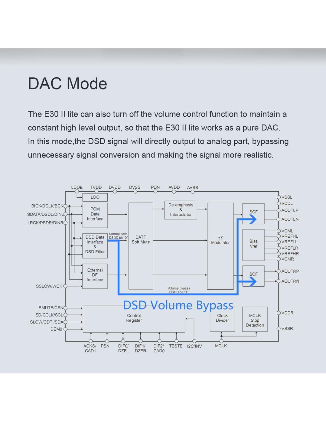 - Soporta audio de alta resolución: El E30 II lite utiliza el chip AK4493S de la tecnología VELVET Sound de AKM. Ha ganado amplio reconocimiento entre los entusiastas del audio por su rendimiento excepcional y calidad de sonido de primer nivel. Con el AK4493S, el E30 II lite tiene un rango dinámico de hasta 121dB y THD<0.0004%.