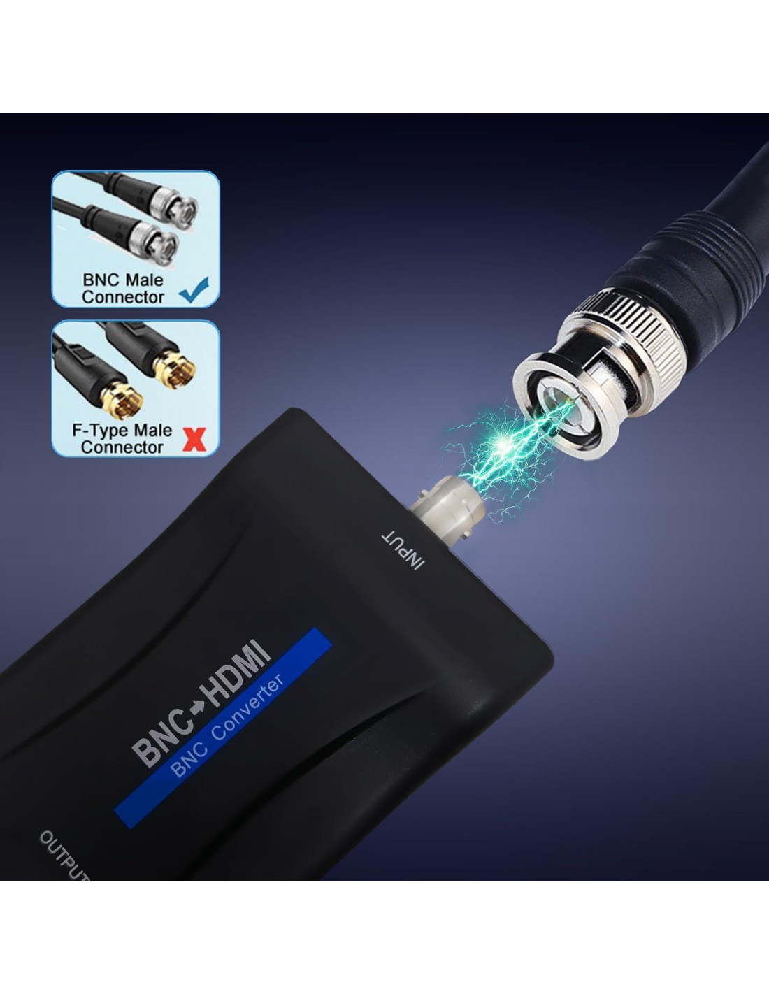 Nota: Este convertidor de BNC a HDMI NO incluye cables. Antes de comprar, asegúrese de tener cables BNC compatibles para una conectividad adecuada. Si no está seguro, comuníquese con nuestro equipo de atención al cliente para obtener asistencia. Esto ayudará a evitar problemas de compatibilidad y asegurará que el producto cumpla con sus necesidades. 1. Nueva generación de procesamiento de chip digital de bajo consumo, 24 horas de trabajo continuo con poco calor. 2. Tecnología de compensación 3D. 3. Tecnología de procesamiento DCDI. 4. Tecnología de procesamiento de video escalador. 5. Usando tecnología I2S la señal de audio analógica L/R. El orden de conexión es crucial ya que determina si el dispositivo funcionará. Primero, conecte el cable de alimentación y el cable BNC. Una vez que todo esté listo, luego conecte el cable HDMI. Nota: La entrada de este convertidor de BNC a HDMI es Coax BNC, no para Coax RF. No funciona para antena y televisión por cable.