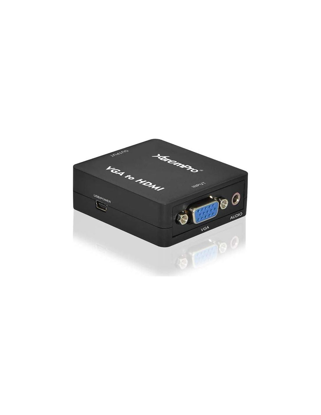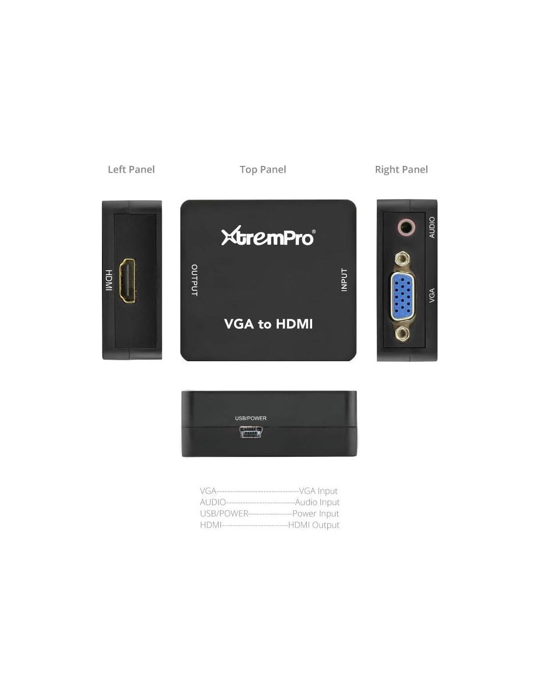 El adaptador convertidor de VGA a HDMI XtremPro 1800p full HD Mini VGA a HDMI convertidor de audio video con puerto de audio de 3.5mm, Soporta HDTV, computadora portátil PC, proyector, DVD - Negro (61086) introducción: el producto convertidor de VGA a HDMI se utiliza para convertir una señal analógica de VGA a una señal digital de HDMI. Se puede usar con computadoras y otros dispositivos con una interfaz de salida VGA y se conecta a un HDTV, proyector u otra pantalla con una entrada HDMI. El convertidor; soporta una amplia gama de resoluciones de entrada y es fácil de configurar para conveniencia y compatibilidad. Características: bajo consumo de energía alimentado por USB instalación fácil de conectar y usar Compatible con HDMI V1.3 contenido del paquete: MANUAL x1 unidad principal x1 cable de alimentación USB x1