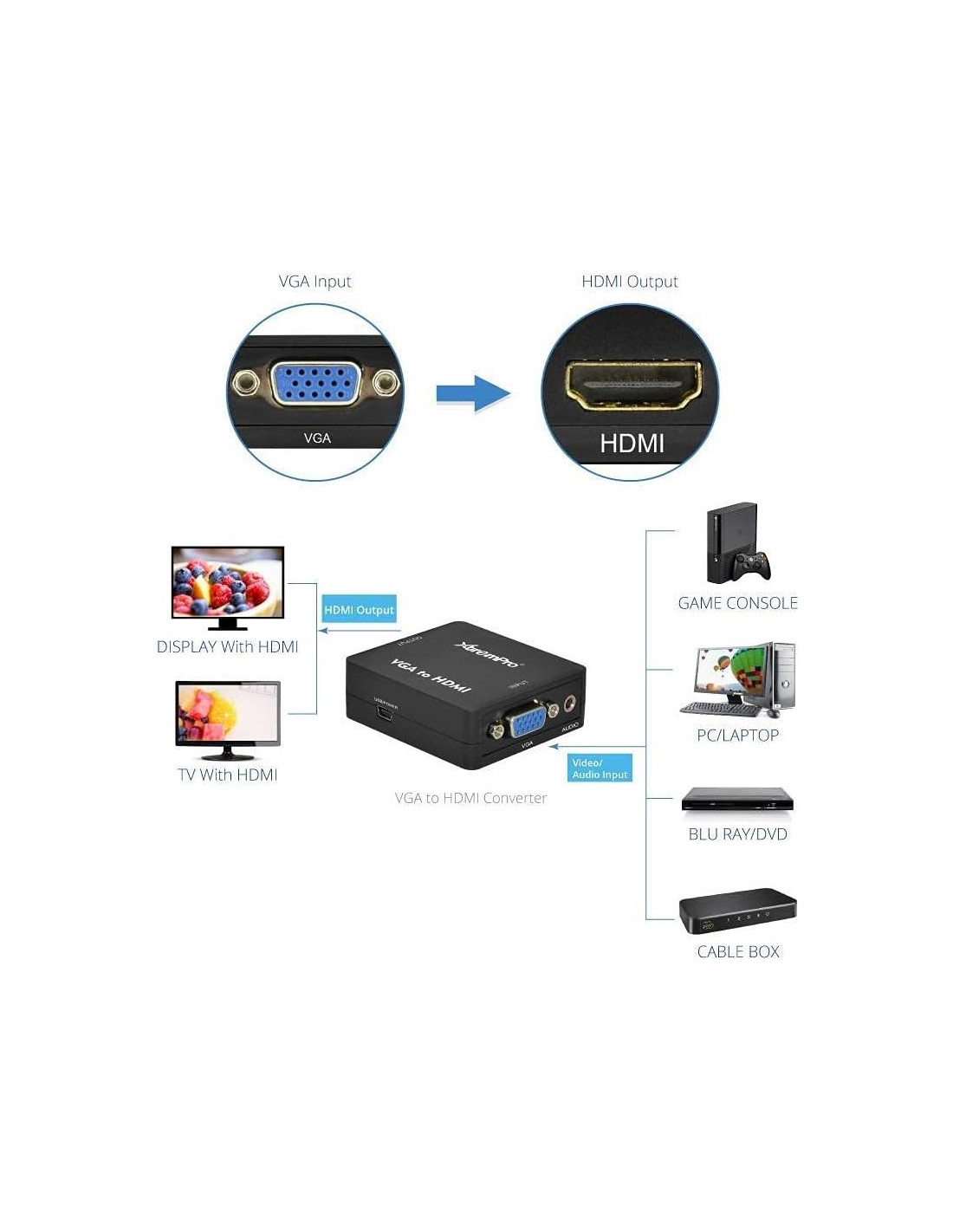 - Amplia compatibilidad - la mayoría de los dispositivos de salida con puertos VGA como escritorio, laptop, caja de HD TV, consola de juegos, y la mayoría de los dispositivos de entrada con puerto HDMI como monitores/HDTV/proyector. Alimentado por cable de alimentación USB, el convertidor es compatible con más dispositivos que aquellos sin alimentación externa.
