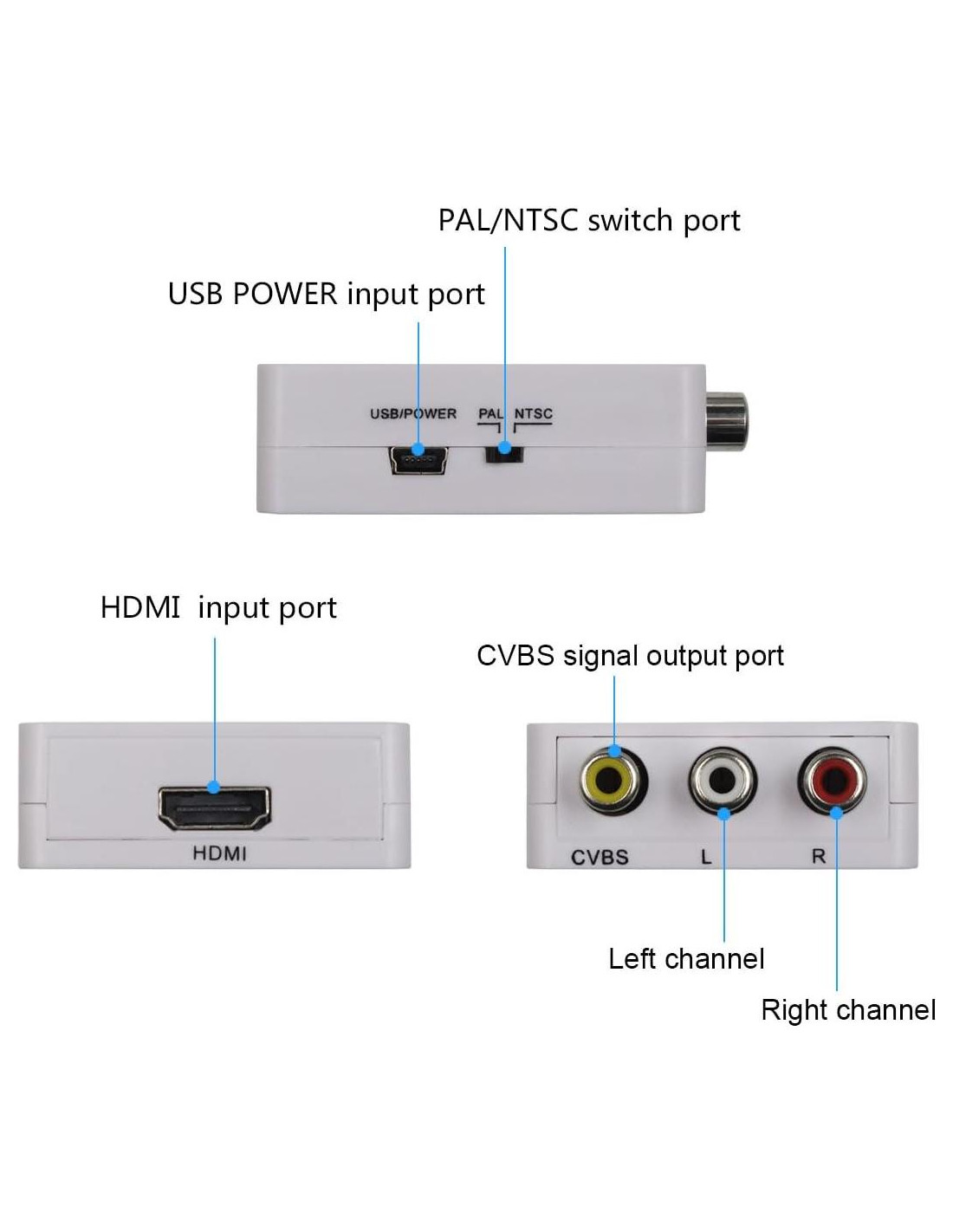 El adaptador de señal AV mini HDMI que cambiará la señal de video HDMI o la señal de audio a señal de video compuesta AV (CVBS) y las señales de audio estéreo FL / FR, mientras soporta señales de línea lateral del sistema DVI. Para ayudar a los usuarios a cambiar la alta calidad de la señal de video HDMI a una señal CVBS normal (definición estándar 480i, 576i). Para que se pueda reproducir en TV, VHS VCR, grabadoras de DVD, etc. También soporta dos formatos de TV NTSC y PAL. *Opción opcional para sistemas de video de salida: PAL/NTSC. * No necesita instalar controladores, portátil, flexible, plug and play * Bajo consumo de energía, no necesita fuente de alimentación * Salida de audio sincronizada con video * Capacidad de ancho de banda alto soporta 1920x1080@60Hz * Compatible con HDMI 1.3 * Puertos de entrada: HDMI tipo hembra * Puertos de salida: AV RCA Resolución de entrada HDMI: 480i/480p, 576i/576p, 720p, 1080i/1080p CVBS salida: PAL, NTSC_M,(NTSC_J) 1 x Convertidor HDMI a AV 1 x Adaptador de corriente de EE. UU. 1 x Manual del usuario