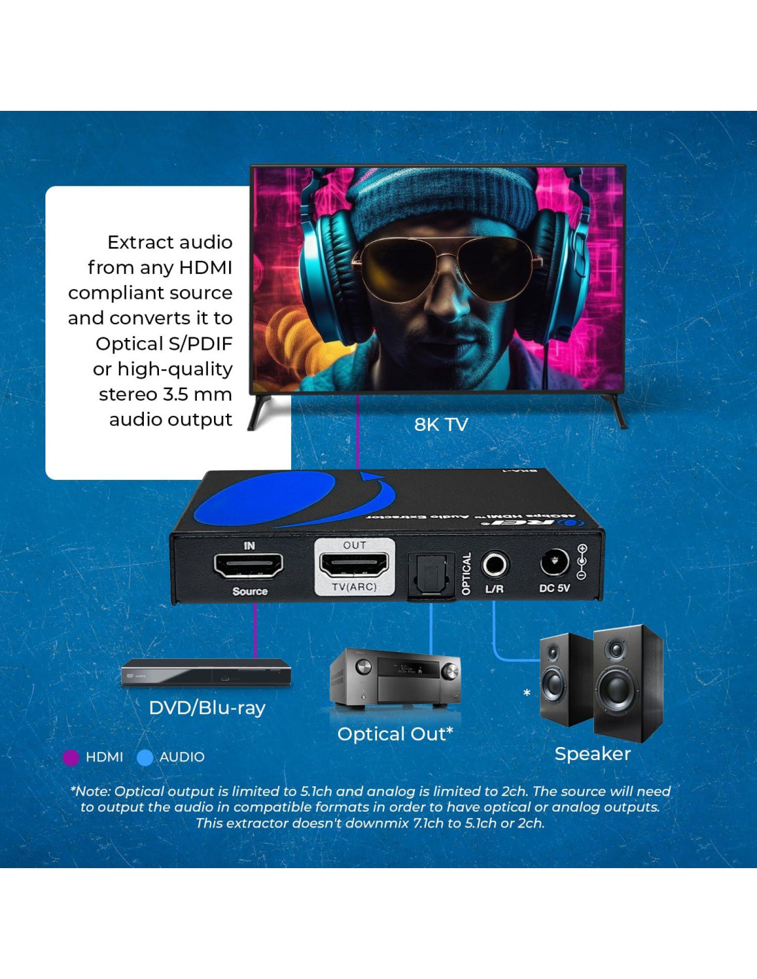 - Extractor de Audio 8K - Diseñado para extraer audio de cualquier fuente compatible con HDMI y convertirlo a salida de audio óptica S/SPDIF o estéreo de alta calidad de 3.5 mm | Entrada: 1x HDMI, Salida: 1x HDMI ARC, 1x Salida de Audio L/R, 1x Salida Óptica (S/SPDIF)