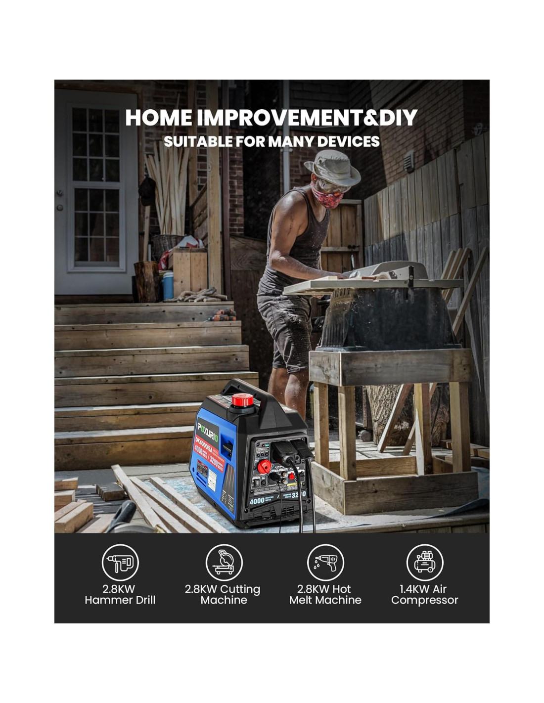 - Nombre del modelo: Generador Inversor Portátil POXURIO, DK4000iSA, Gas de 4000W Súper Silencioso Modo Ecológico/Listo para RV/Ligero/Cumple con EPA/CARB para Camping al Aire Libre, Hogar, Camión de Comida, Viaje