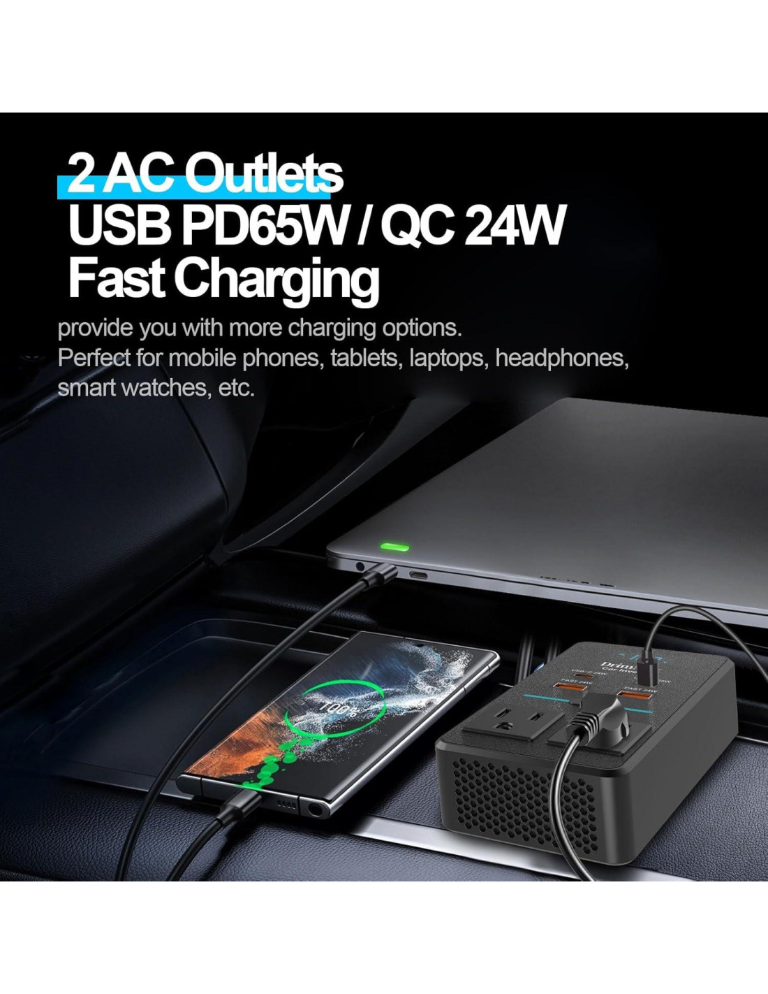 - [Adaptador de Encendedor de Cigarrillos de 300W] Este adaptador de encendedor de cigarrillos de 300W ofrece una robusta salida de energía y múltiples puertos de carga para satisfacer diversas necesidades en la carretera. Duales salidas AC manejan dispositivos de alta potencia como laptops y pequeños electrodomésticos, mientras que dos puertos USB-C (24W y 65W) y dos puertos USB-A de 24W proporcionan carga rápida para varios electrónicos. La configuración de múltiples puertos permite la carga simultánea de múltiples dispositivos, asegurando que no se quede sin energía. Ideal para vehículos de 12V, ofrece un soporte confiable para viajes familiares, camping y situaciones de emergencia.