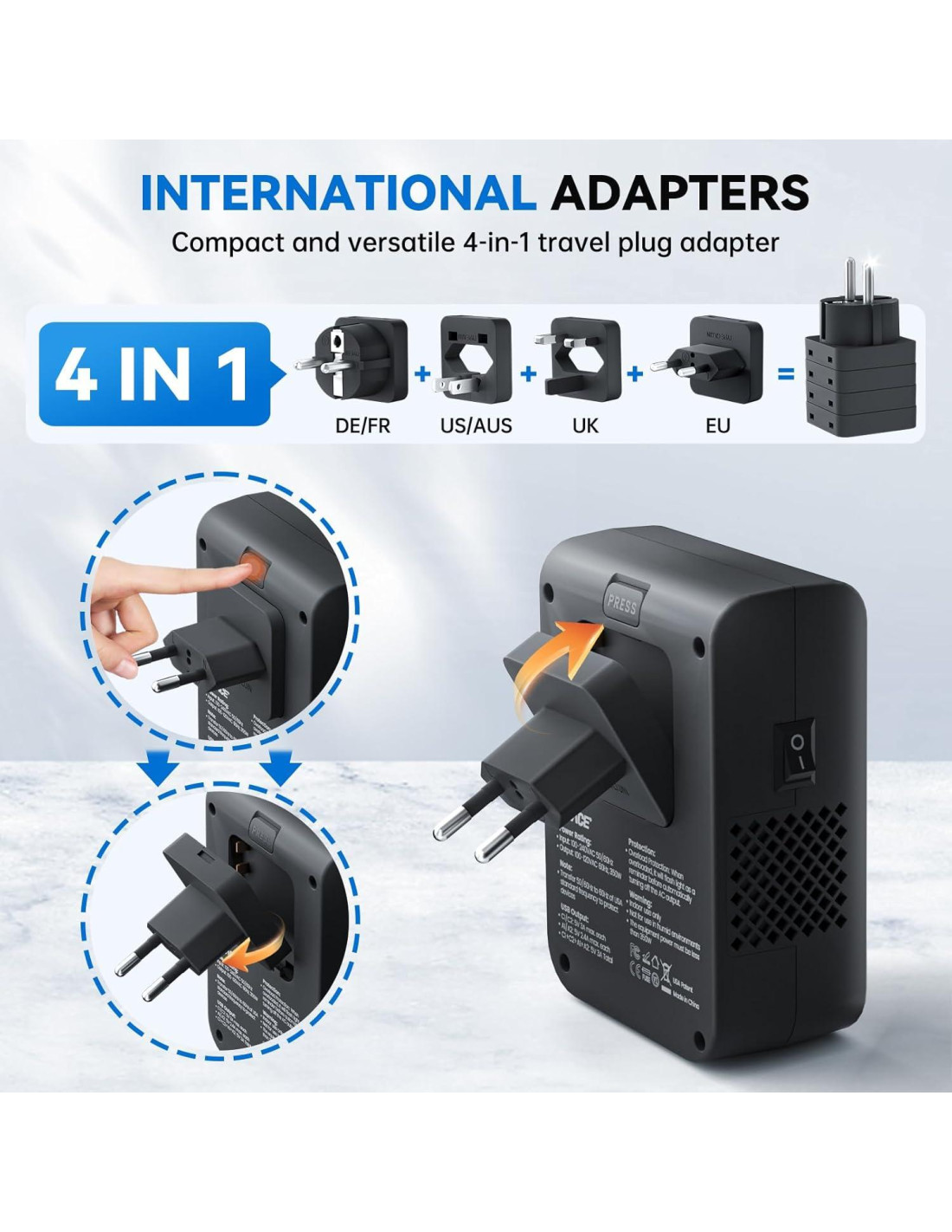 - Portátil y Universal: Viene con 4 adaptadores de viaje internacionales (UE/AU/EE. UU./Reino Unido), permitiéndote alimentar tus dispositivos en más de 200 países. Su tamaño compacto (7.1 x 10.4 x 3.8 cm) y diseño ligero (solo 220 g) lo hacen fácil de llevar en cualquier bolsa y hacer tu viaje más conveniente!