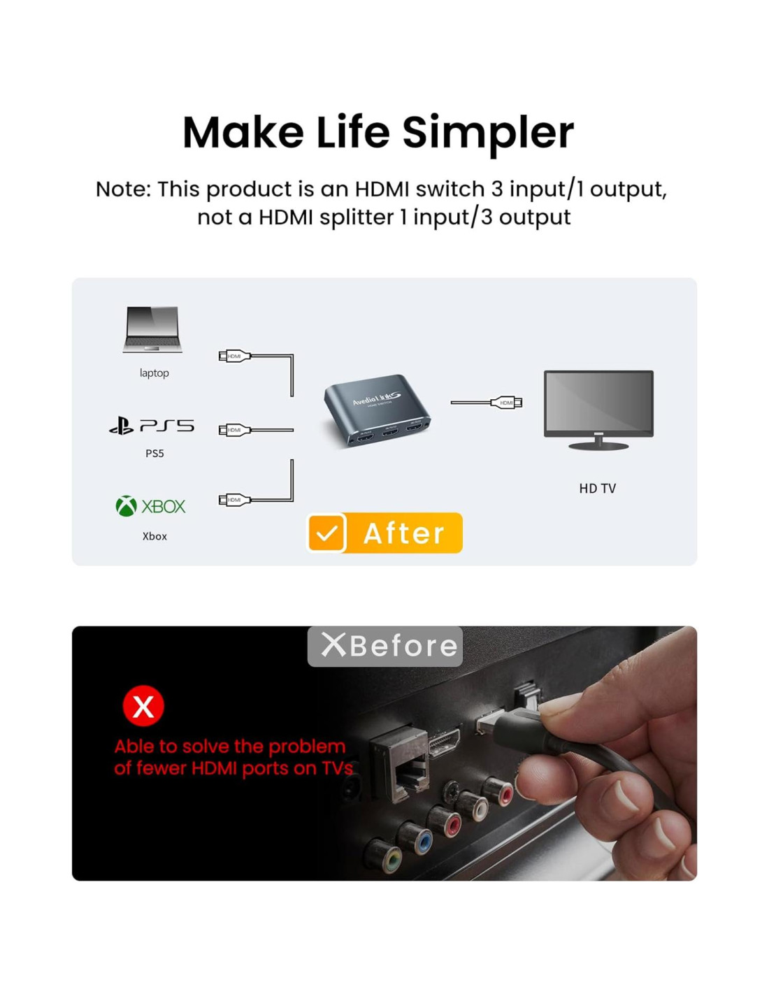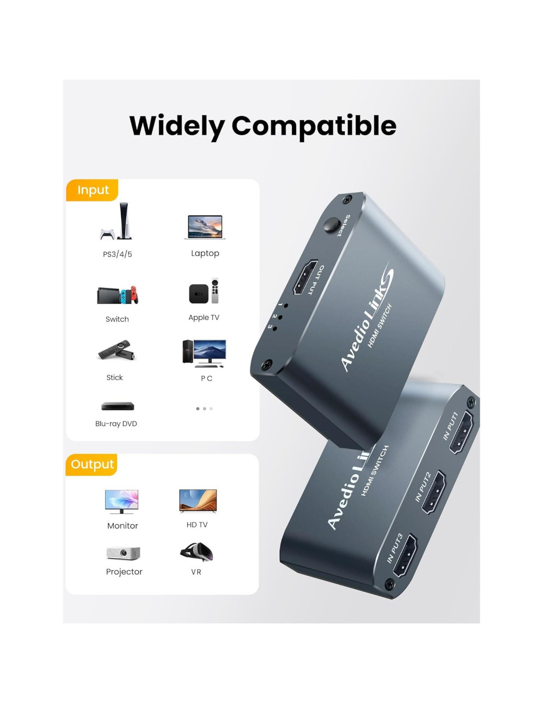- Conmutador HDMI 3 Entradas 1 Salida avedio links Conmutador HDMI 3x1 transmite fácilmente video y audio desde 3 fuentes HDMI diferentes a 1 pantalla HDMI, SIN retraso, SIN parpadeo o caída en la resolución. Cambios fácilmente entre transiciones sin interrupciones, evitando enchufar y desenchufar con frecuencia. Consejos: Es un conmutador HDMI 3 entradas 1 salida, NO soporta 1 en 3 fuera!