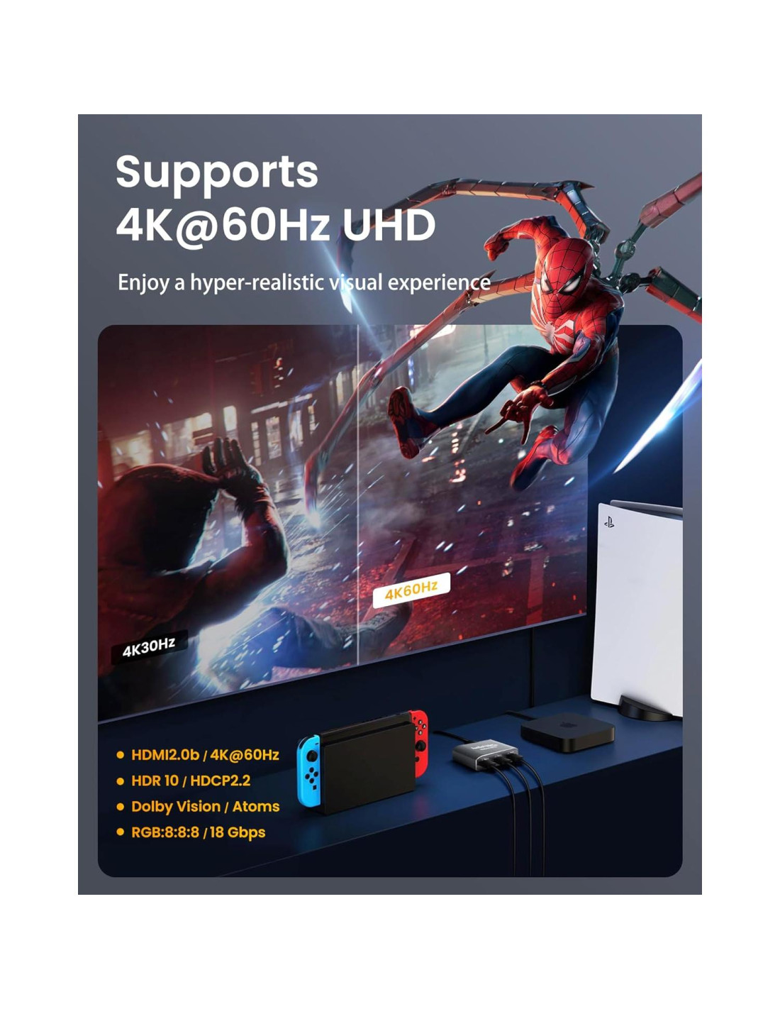 - Calidad y Características Premium el conmutador HDMI 4K@60Hz utiliza los últimos chips, hecho de material de aleación de aluminio, construcción anti-corrosión que también puede resistir sobrecalentamiento o rotura, más duradero y útil. Este conmutador HDMI también soporta Dobly Atmos / Dobly Digital / DTS-HD / Dobly -trueHD / DTS7.1 / Dobly -AC3, Direct Stream Digital. Sin distorsión de audio o video.