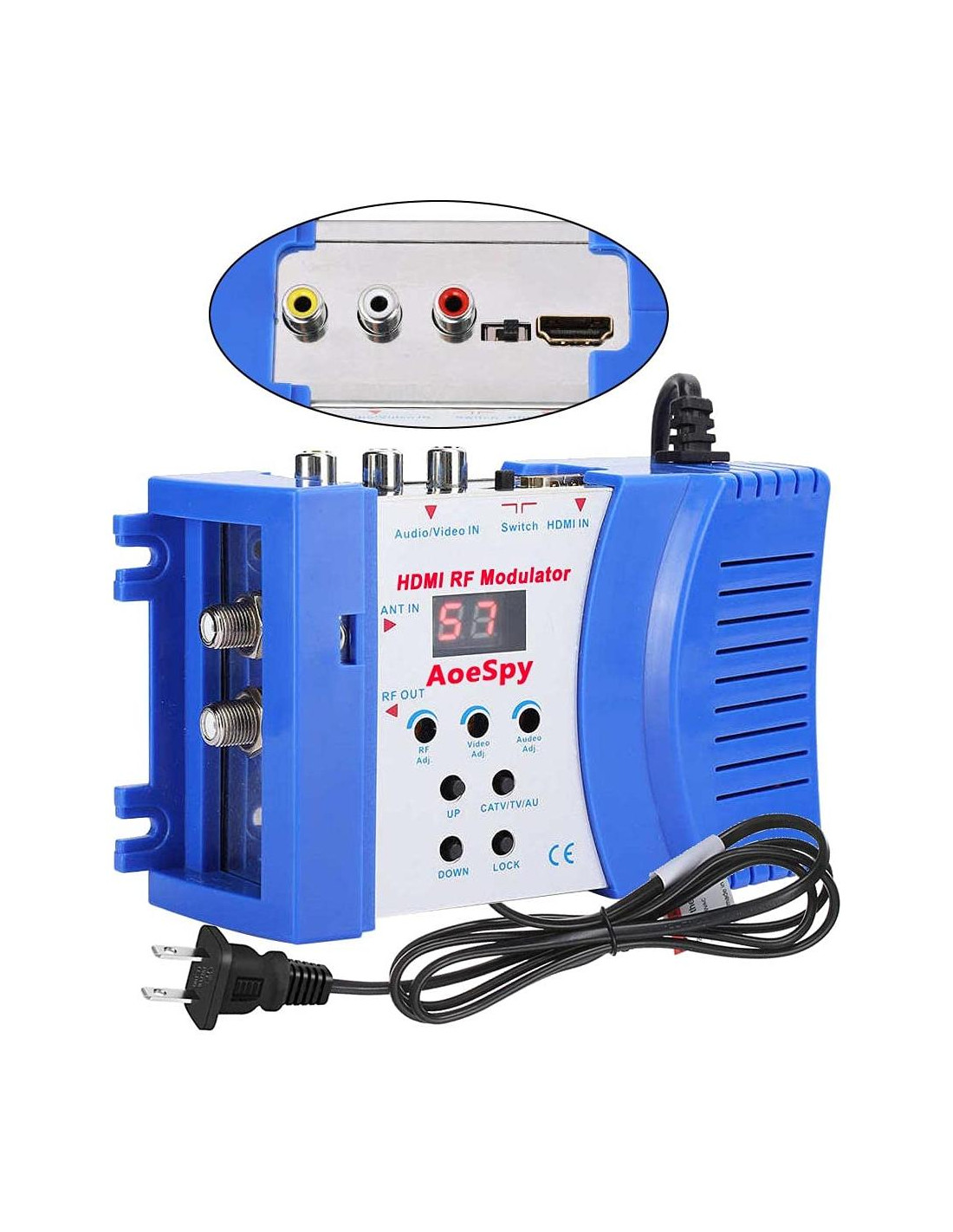 Este modulador RF profesional AoeSpy es un convertidor de HDMI y RCA CVBS a coaxial compuesto para Apple TV, Amazon Fire Stick, Fire TV, Roku, sintonizador de TV HD, satélite Set-top/Caja de Cable o consolas de juegos como PS3, PS4, PS5, Xbox 360, Xbox One, Nintendo Switch, VCRs, reproductores de Blu-ray/DVD, cámaras de video, etc. Componentes más nuevos equipados con HDMI para conectarse con televisores más antiguos que no tienen HDMI ni jacks AV; El potente y funcional demodulador SDR de TV te brindará más beneficios y gran conveniencia mientras ahorras mucho en tu sistema CATV local con su conversión de 3 tipos de señales HDMI, RCA y RF con entrada de antena, NTSC y PAL 2 formatos de TV diferentes, VHF y UHF 2 frecuencias operativas hasta 136 canales de banda completa, y viene con la pantalla digital de canal y el interruptor seleccionable. Generalmente, los dispositivos HDMI tienen una limitación de distancia muy corta al conectarse a un televisor. A través de este convertidor de rf coaxial a hdmi, ya no habrá limitación de distancia. Comparte programas de caja de TV, reproductor de DVD Blu-ray, PC, Laptop, Consola de Juegos o DVR de Seguridad a todos los televisores en casa a través del canal de TV 2 o 3. Incluso puedes ver vigilancia en todos los televisores de tu habitación a través de este dispositivo. Es una gran idea, ¿no?