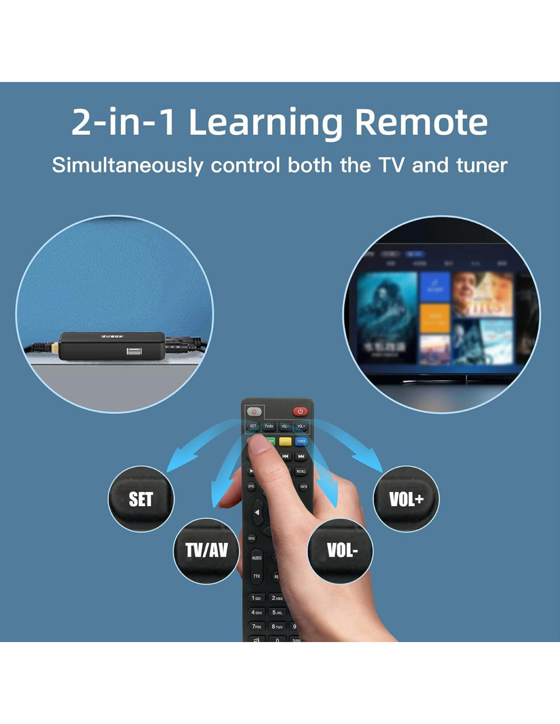 - [Control Remoto Dos-en-Uno] El control remoto dos-en-uno cuenta con una función de aprendizaje, lo que te permite controlar tanto el stick convertidor digital como la TV sin necesidad de dos controles remotos separados. Se requiere emparejamiento antes de su uso, con cuatro botones programables (SET, TV/AV, VOL-, VOL+) disponibles. Solo soporta control remoto por infrarrojos.