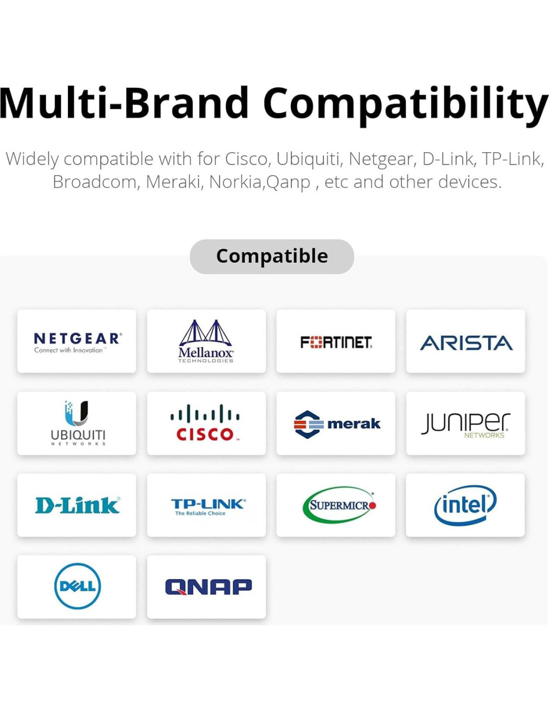 - Amplia Compatibilidad Este módulo es compatible con Cisco, Ubiquiti UF-SM-10G, Meraki MA-SFP-10GB-LR, Mikrotik, Fortinet, Netgear y más interruptores abiertos.