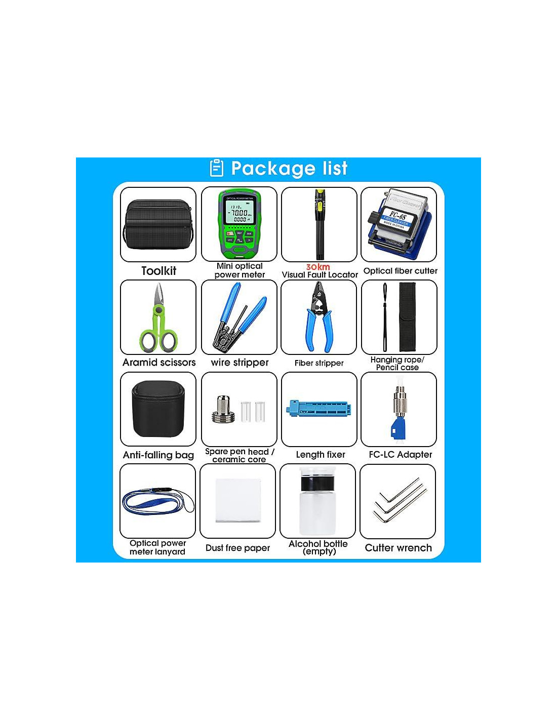 - Accesorios de equipo FTTH: bolsa de herramientas de fibra óptica, cortador de fibra óptica, localizador de fallos visual, medidor de potencia óptica, alicates de pelado de fibra óptica, botella de limpieza, papel de limpieza, dispositivo de longitud fija 2 en 1