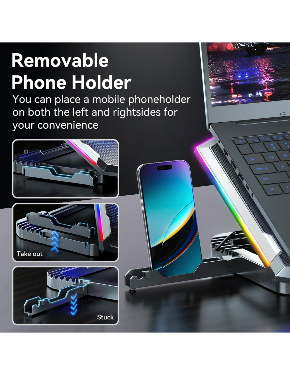 - Susurro Silencioso: Los 8 ventiladores del soporte de enfriamiento para portátil están todos equipados con componentes de capacitor para reducir el ruido de trabajo. El enfriador de portátil para juegos es casi lo suficientemente silencioso como para no notarlo incluso en la configuración máxima.