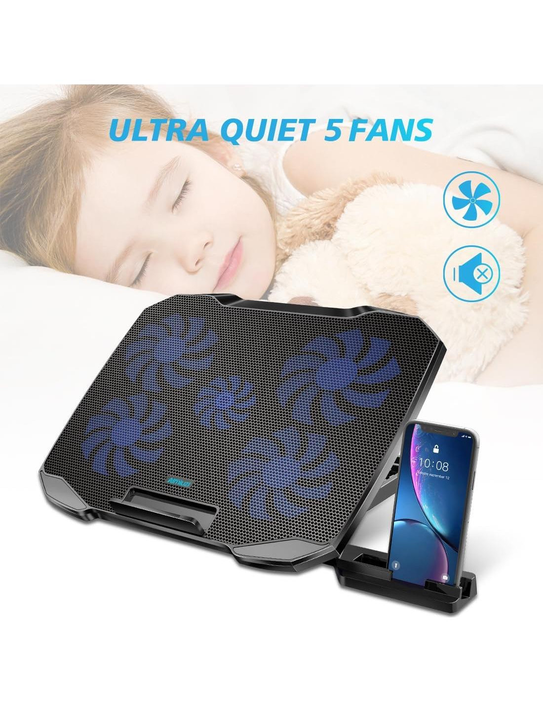 - El enfriador de laptop AIMIUZI está diseñado especialmente para enfriar laptops de hasta 15.6 pulgadas. Malla metálica estilo panal, 1 ventilador pequeño y 4 ventiladores grandes, almohadilla antideslizante plegable, 5 configuraciones de altura ajustable, 2 puertos USB, velocidades ajustables y alimentado por USB.