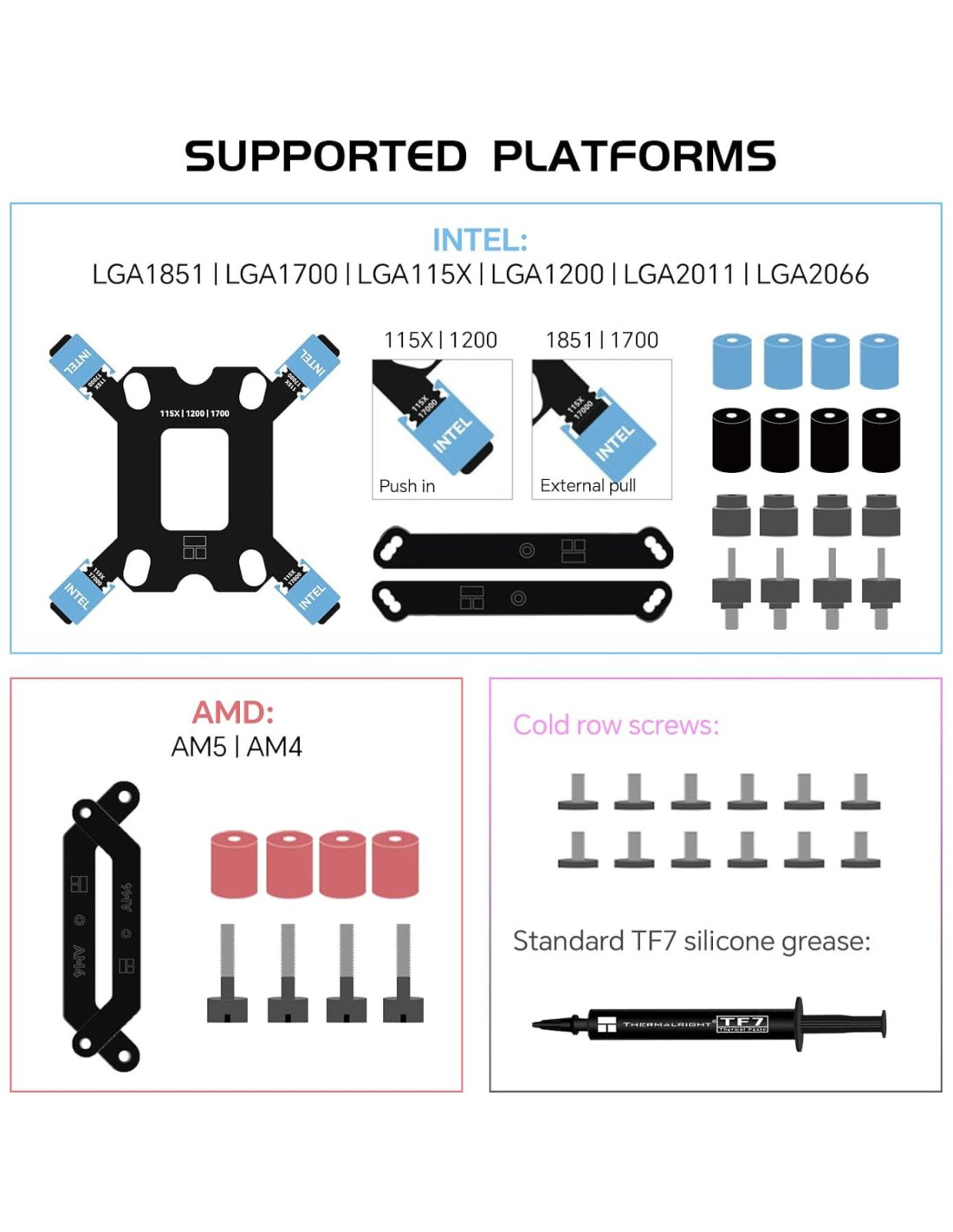 - [Amplia compatibilidad] Soporta AMD: AM4/AM5, Intel: LGA1150/1151/1155/1156/1200/2011/2066/1700/1851, cada plataforma viene con los sujetadores de montaje apropiados, se recomienda instalar de acuerdo con las instrucciones/video de instalación (las plataformas AMD requieren el uso de la placa de respaldo original de la placa base para instalar el producto que no viene incluido)