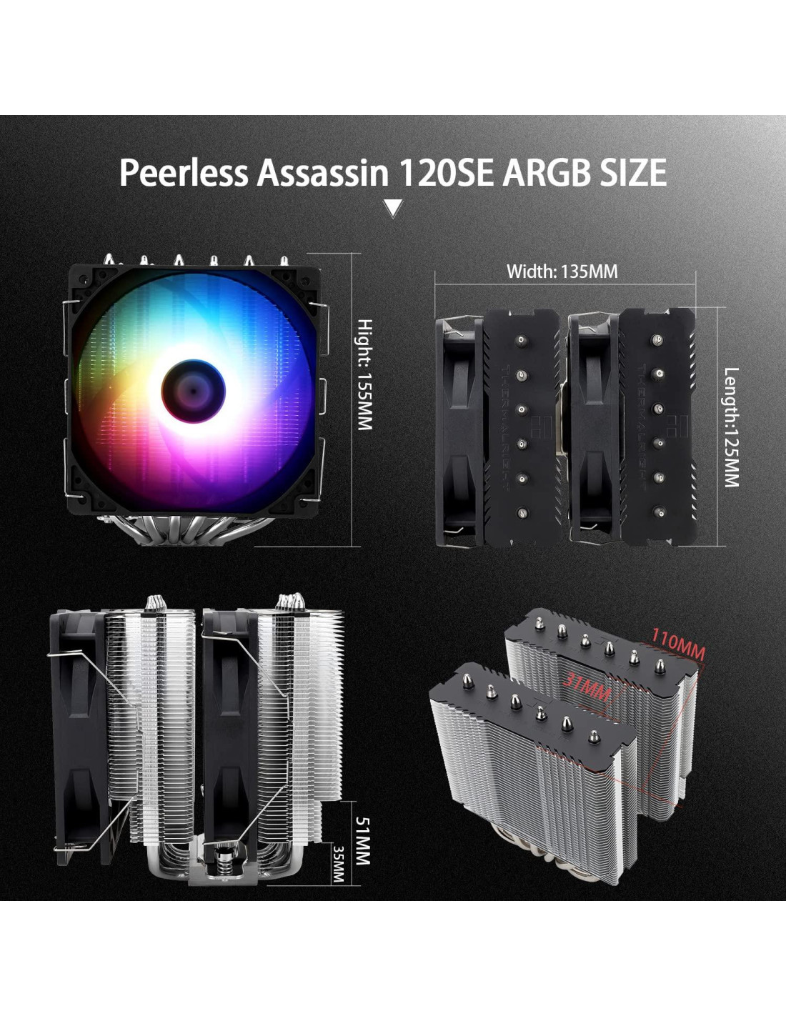 - [Especificación del producto] Thermalright PA120 SE ARGB; Dimensiones del enfriador de CPU: 125(L)x135(W)x155(H)mm (4.92x5.31x6.1 pulgadas); material del disipador: aluminio, el enfriador de CPU está equipado con sujetadores metálicos de la plataforma Intel y AMD para lograr una mejor instalación, el enfriamiento de doble torre es más fuerte.