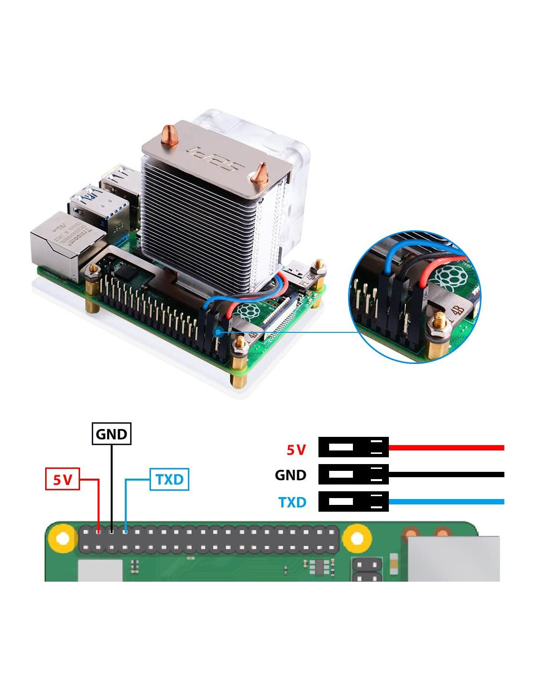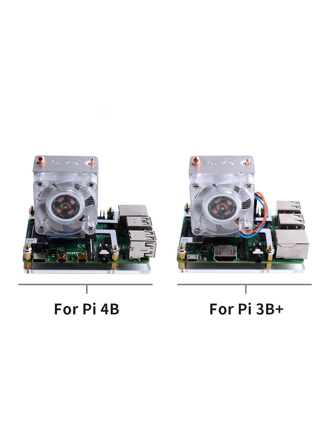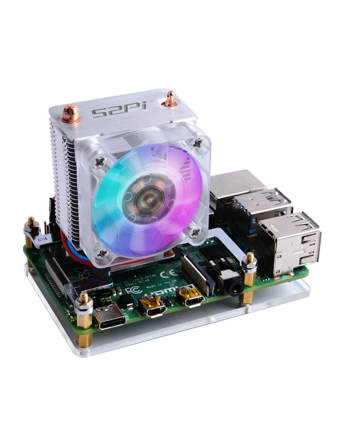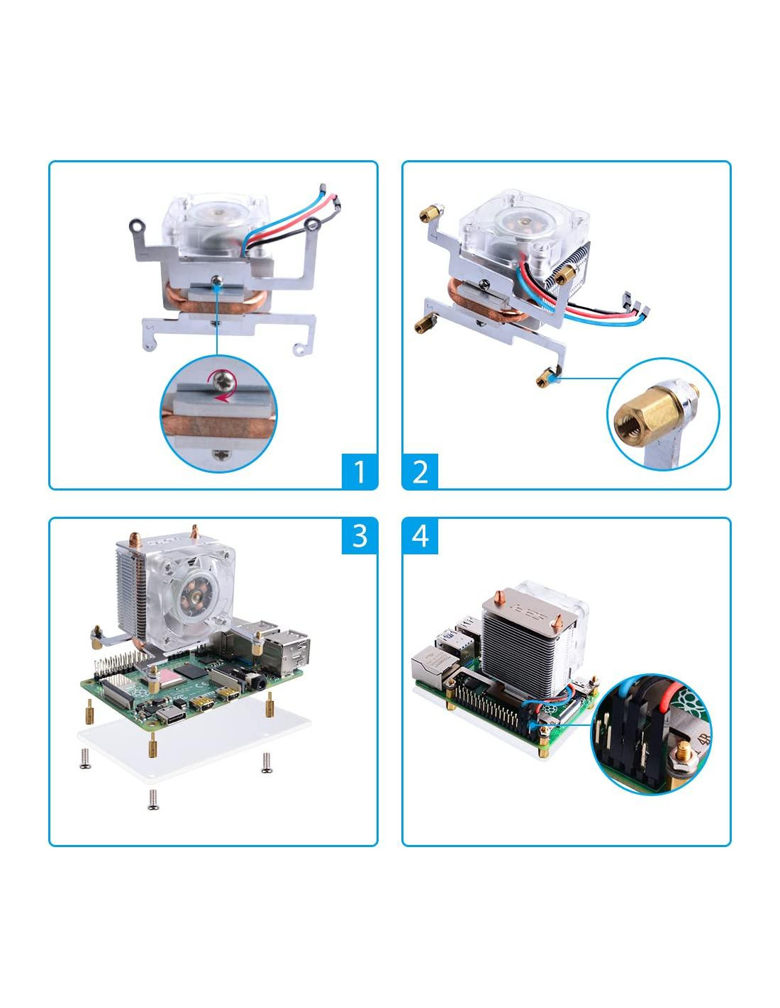 Somos 52PI Technology, un equipo de creadores electrónicos profesionales. Nos especializamos en diseñar y producir accesorios de fabricación DIY como accesorios para Raspberry Pi, kits de arduino, módulos electrónicos, pantallas LCD, carcasas y disipadores de calor y más. Crea posibilidades infinitas con estos componentes, llevándote al mundo de la electrónica y convirtiendo tus ideas en realidad. Según la ley de Moore, el diseño de placas de circuito impreso (PCB) de alta velocidad y alta densidad se está volviendo cada vez más complejo. Un mayor rendimiento de procesamiento generará más calor. Este super ventilador de enfriamiento de CPU Torre de Hielo para Raspberry Pi está diseñado para resolver el problema de la disipación de calor. Estructura en torre, tubo de cobre de 5mm, disipadores de calor de múltiples capas, ventilador potente de 7 aspas, todas las combinaciones anteriores hacen de este super radiador para Raspberry Pi. En el caso de overclocking, puede reducir la temperatura de la placa Pi de 80C (176F) a 40C (104F). Lo mejor de todo, este super ventilador de enfriamiento es compatible tanto con Raspberry Pi 3 como con la nueva Raspberry Pi 4. Cuando el ventilador se enciende, verás el color del hielo. Las luces LED azules muestran el concepto de hielo, es el origen de su nombre.