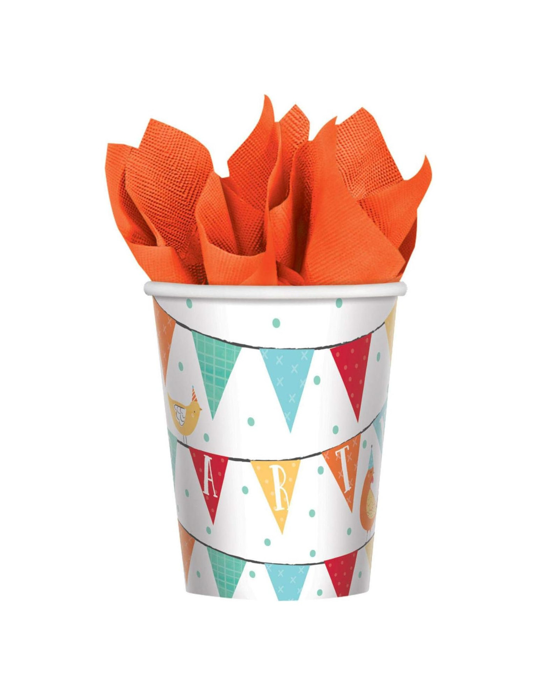Deja que todos los que asistan al Cumpleaños temático de la Granja disfruten de las bebidas. Usa estos vasos para jugo, refrescos o para sostener suministros de manualidades en la fiesta temática de la Granja de tu hijo. El paquete contiene 8 piezas, vasos desechables de 9 oz. que presentan diseños de coloridos banderines, un encabezado de "Fiesta" y un pollito y una gallina usando sombreros de fiesta.