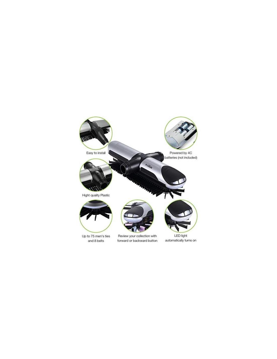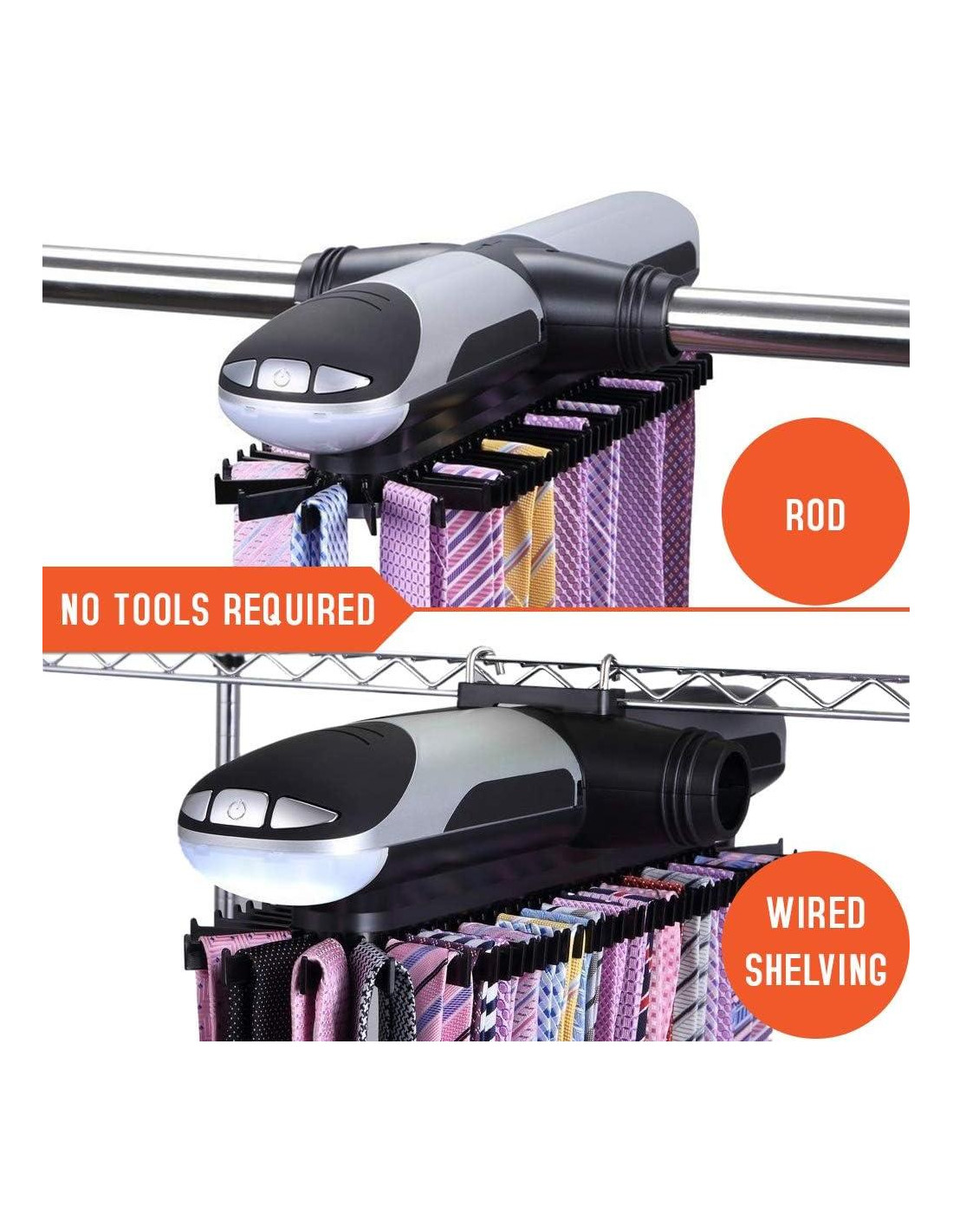 - Este organizador de corbatas para hombres de Primode rota automáticamente con solo presionar un botón. Viene con tornillos especiales para barras colgantes o ganchos para estanterías de alambre, alimentado por 4 baterías C (no incluidas)