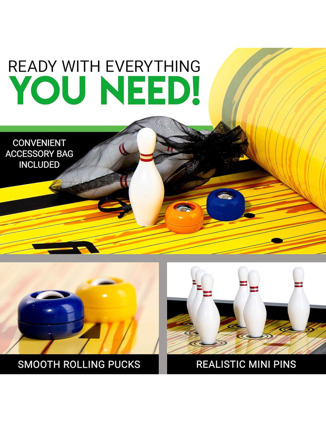- TODO EN UN SOLO JUEGO: Este conjunto viene con (1) tapete de shuffleboard, (2) discos de hock mini y (6) pines de boliche mini pesados, así que tienes todo lo que necesitas para comenzar