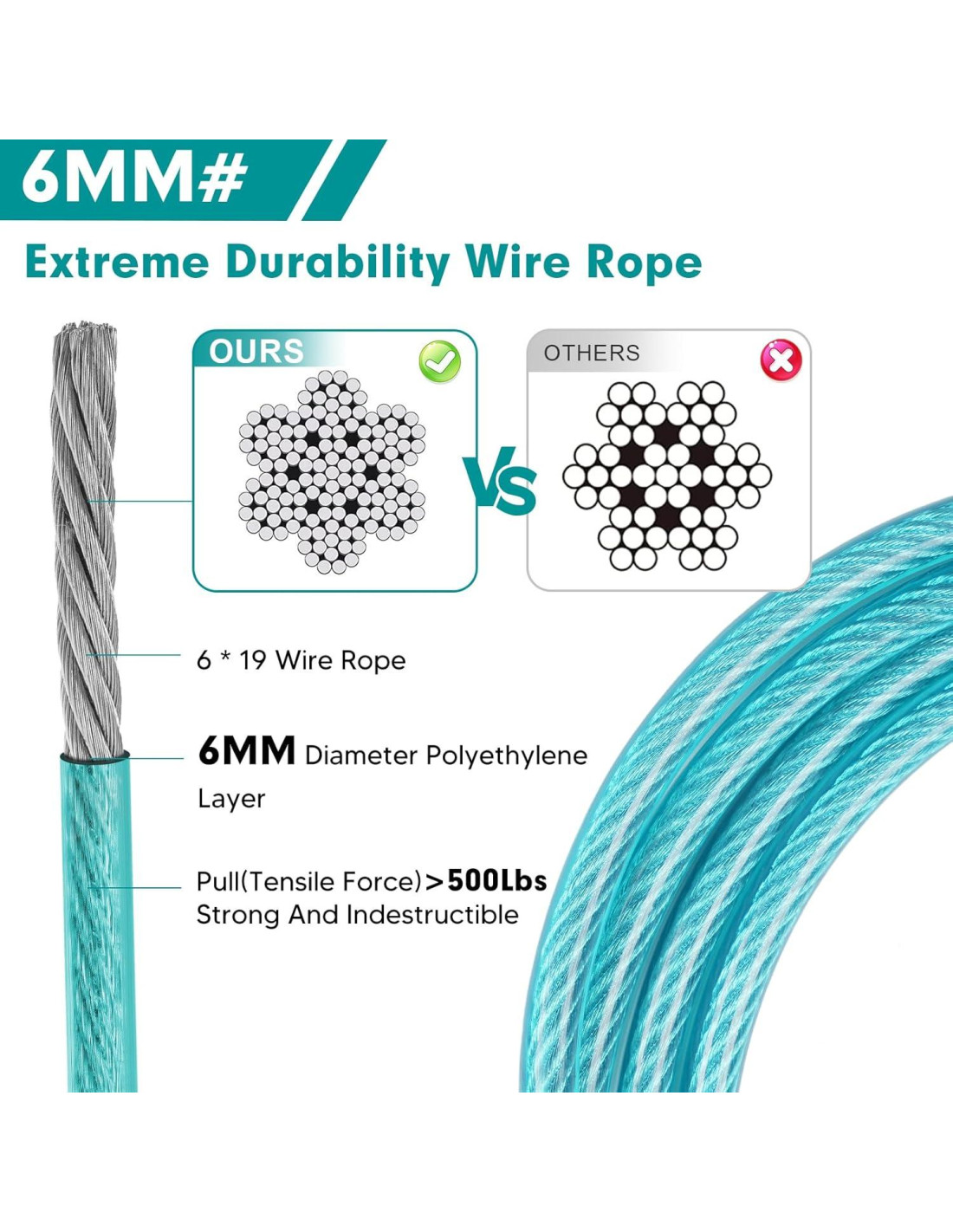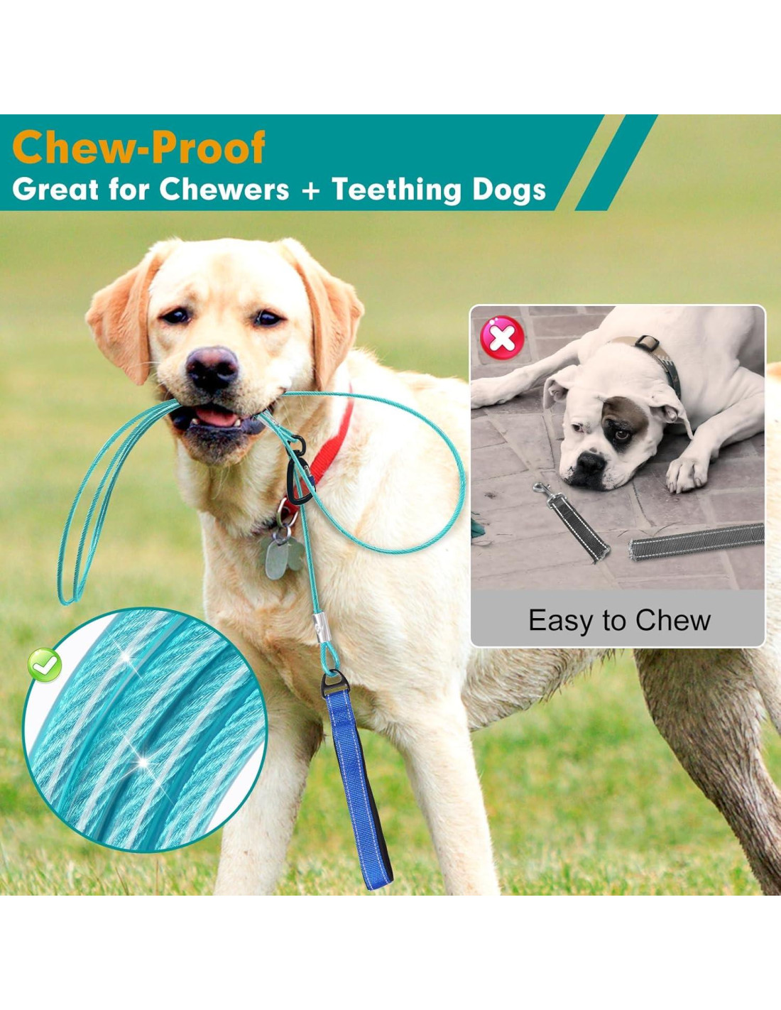 - A prueba de mordeduras y durabilidad: Esta correa para perros a prueba de mordeduras de 1.83 m está hecha de alambre de acero inoxidable de 6 mm recubierto de vinilo, ultra resistente y más masticable que las cuerdas de nylon, ideal para perros que muerden y cachorros en dentición