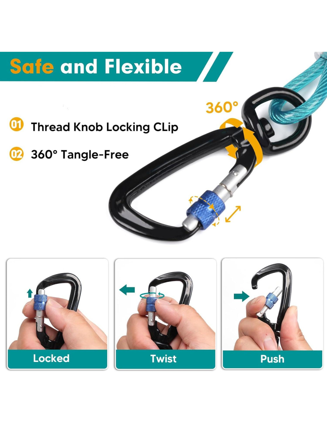 - Clip seguro y flexible: Nuestra correa larga para perros cuenta con un clip giratorio de 360 con bloqueo de seguridad que permite a tu amigo peludo moverse libremente pero sin el riesgo de escapar en el jardín, parque o área de camping