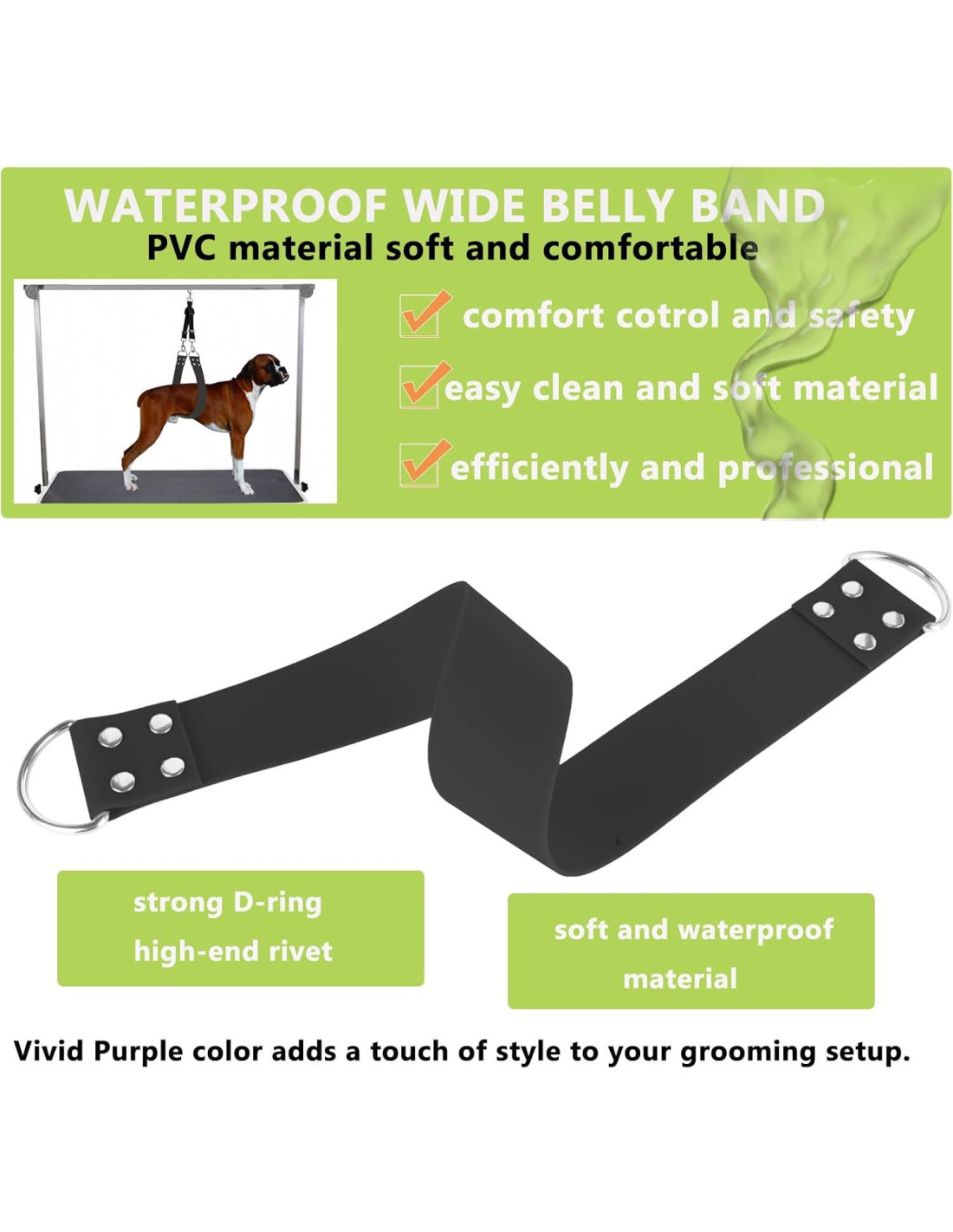 - Material Impermeable Premium - Hecho de material impermeable de alta calidad, esta correa de acicalamiento es fácil de limpiar y altamente resistente a la humedad, asegurando un uso duradero en cualquier entorno de acicalamiento, disponible en 4 colores (púrpura, negro, verde, rosa, turquesa).