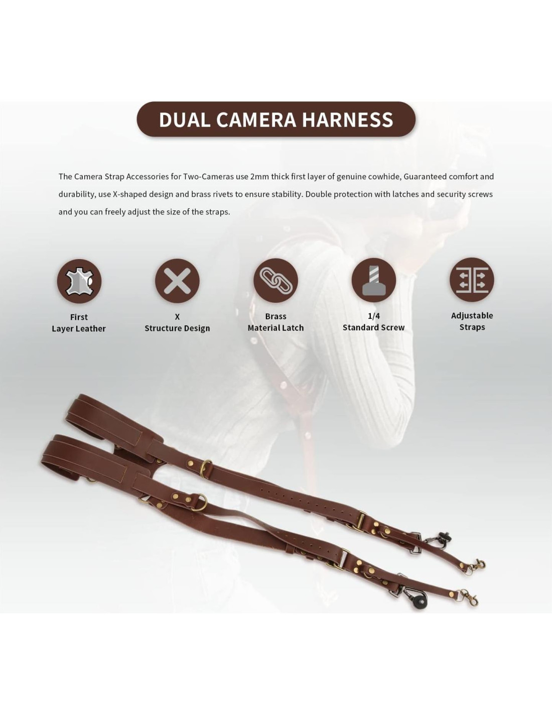 Los Accesorios de Correa para Cámara para Dos Cámaras utilizan cuero de vaca genuino de primera capa de 2 mm de grosor, garantizando comodidad y durabilidad, utilizan un diseño en forma de X y remaches de latón para asegurar estabilidad. Doble protección con ganchos y tornillos de seguridad y puedes ajustar libremente el tamaño de las correas.