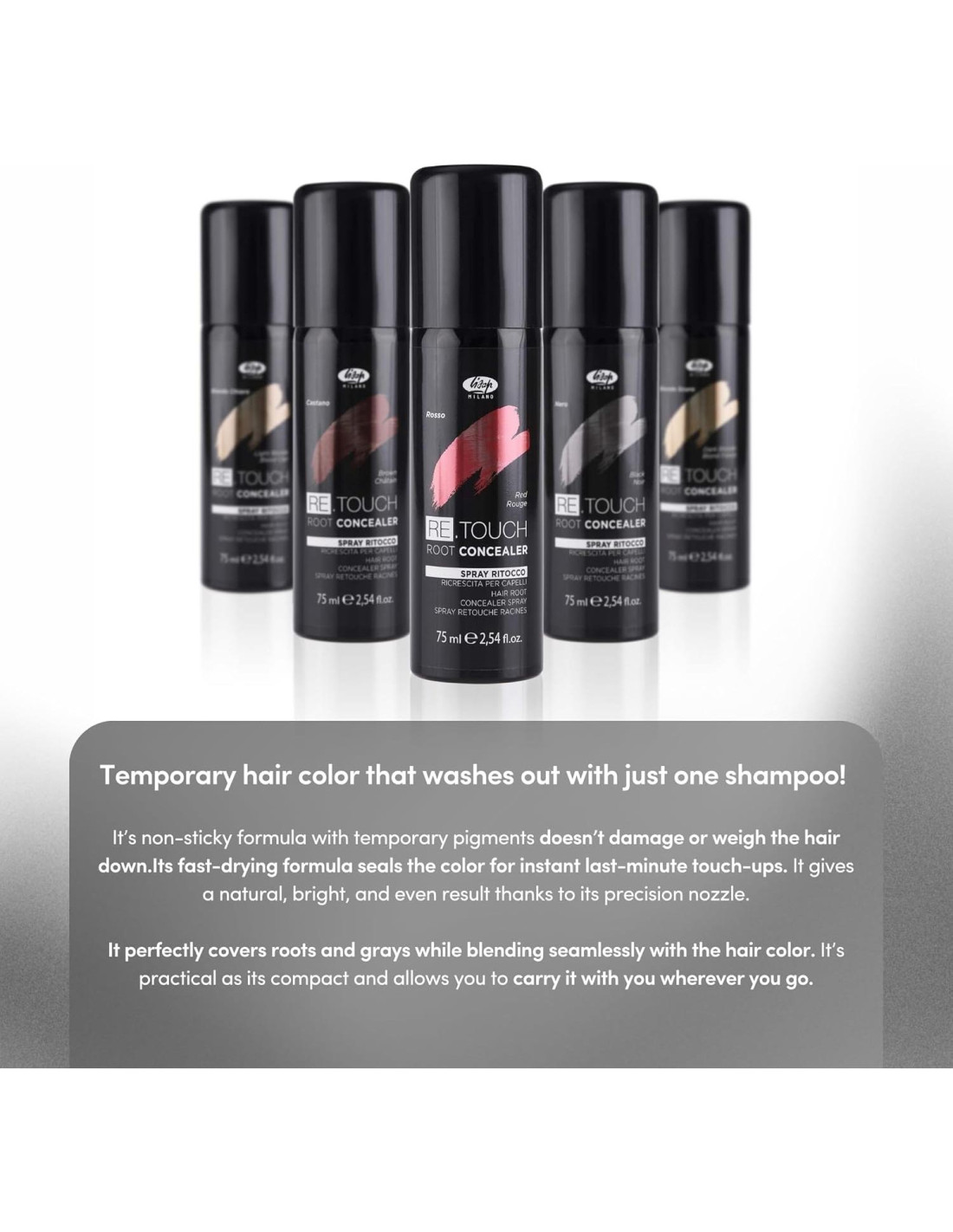 - RETÓCATE EL COLOR DEL CABELLO EN SEGUNDOS: Spray de color de cabello temporal de Lisap Milano oculta huecos de color y cabello blanco para un tono natural, brillante y uniforme, lavable con champú.