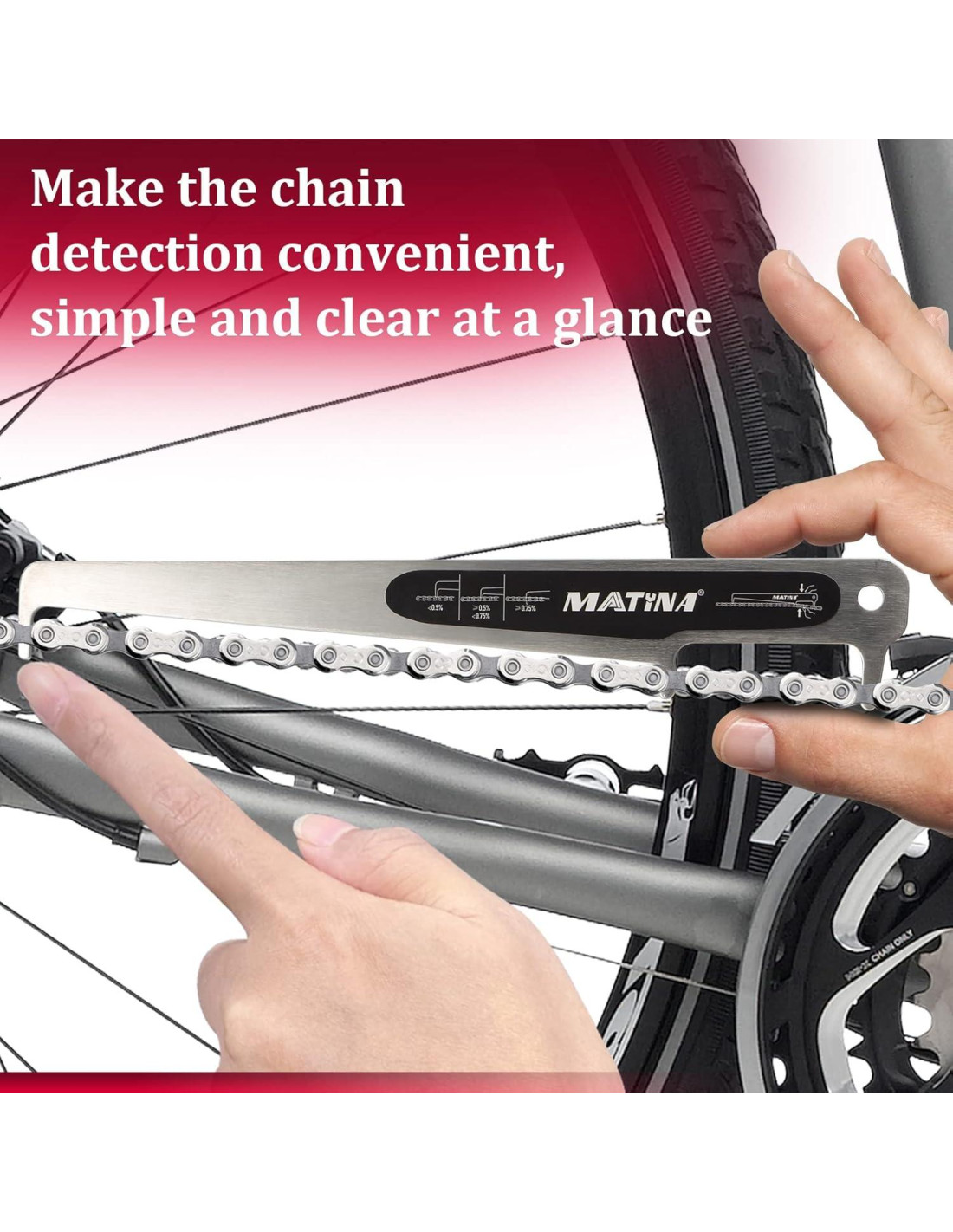 La comprobadora de cadena es un medidor portátil plug and play adecuado para cualquier cadena de desviador de 5 a 12 velocidades. Puede detectar un desgaste de cadena del 0.5% y 0.75% con marcas de medición permanentes.
