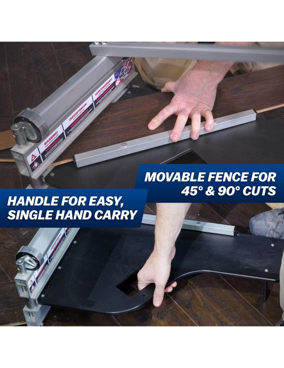 - Las características únicas incluyen una cerca de aluminio móvil para cortes precisos y repetibles de 45 grados, cortes de 90 grados, y un mango integrado para un fácil transporte con una sola mano