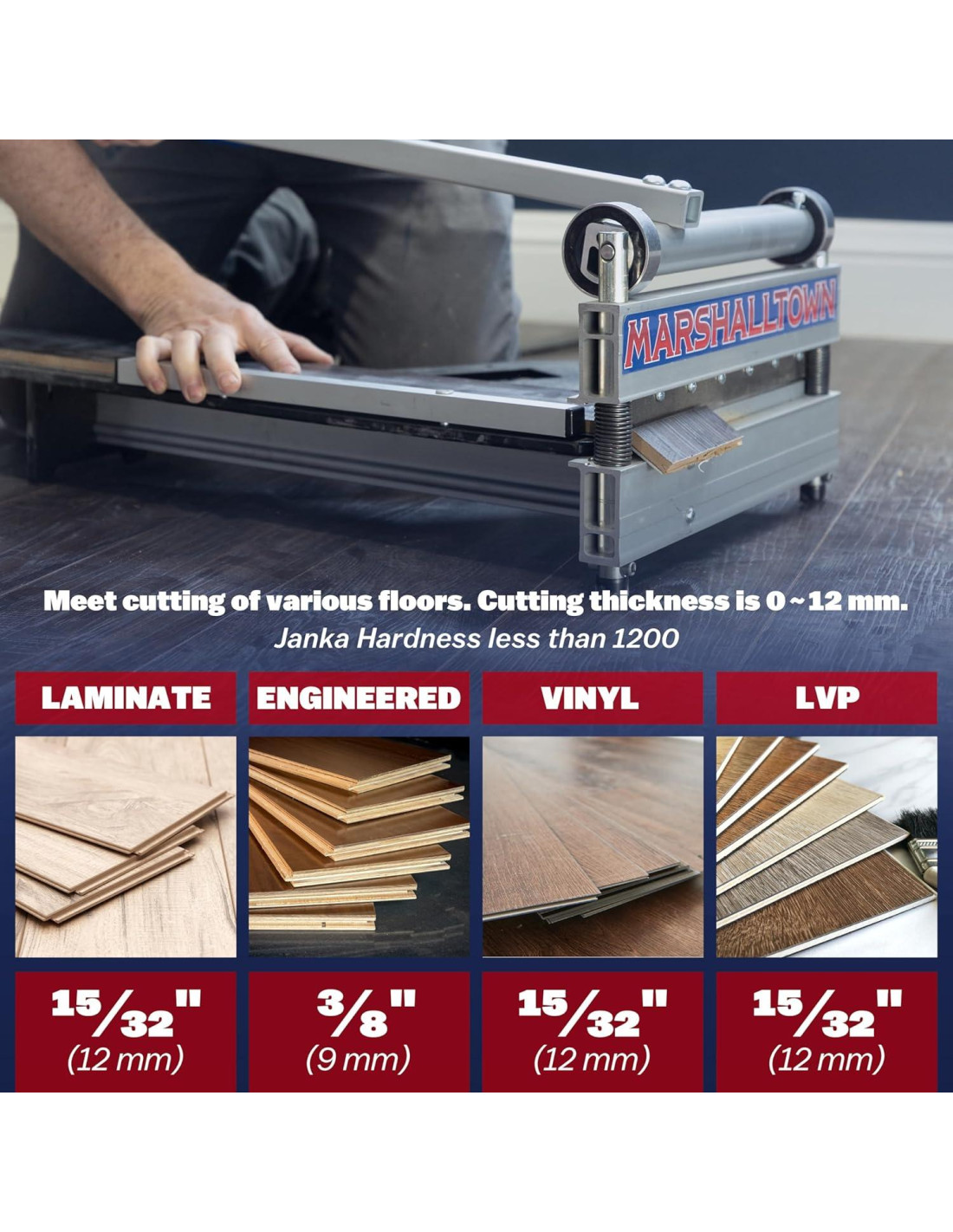 La cortadora de suelos Ultra-Lite MARSHALLTOWN de 33 cm puede cortar productos de hasta 33 cm de ancho, 12 mm de grosor, y una dureza Janka de hasta 1200.