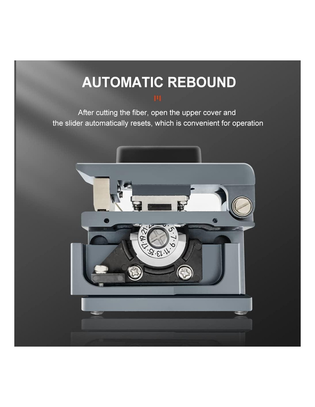 - El Soporte de Fibra 3 en 1 es adecuado para fibra desnuda, pigtail y cable de cuero. La Cuchilla de Acero de Tungsteno tiene 24 puntos de corte con 48000 tiempos de corte, y su ángulo de corte es <0.5