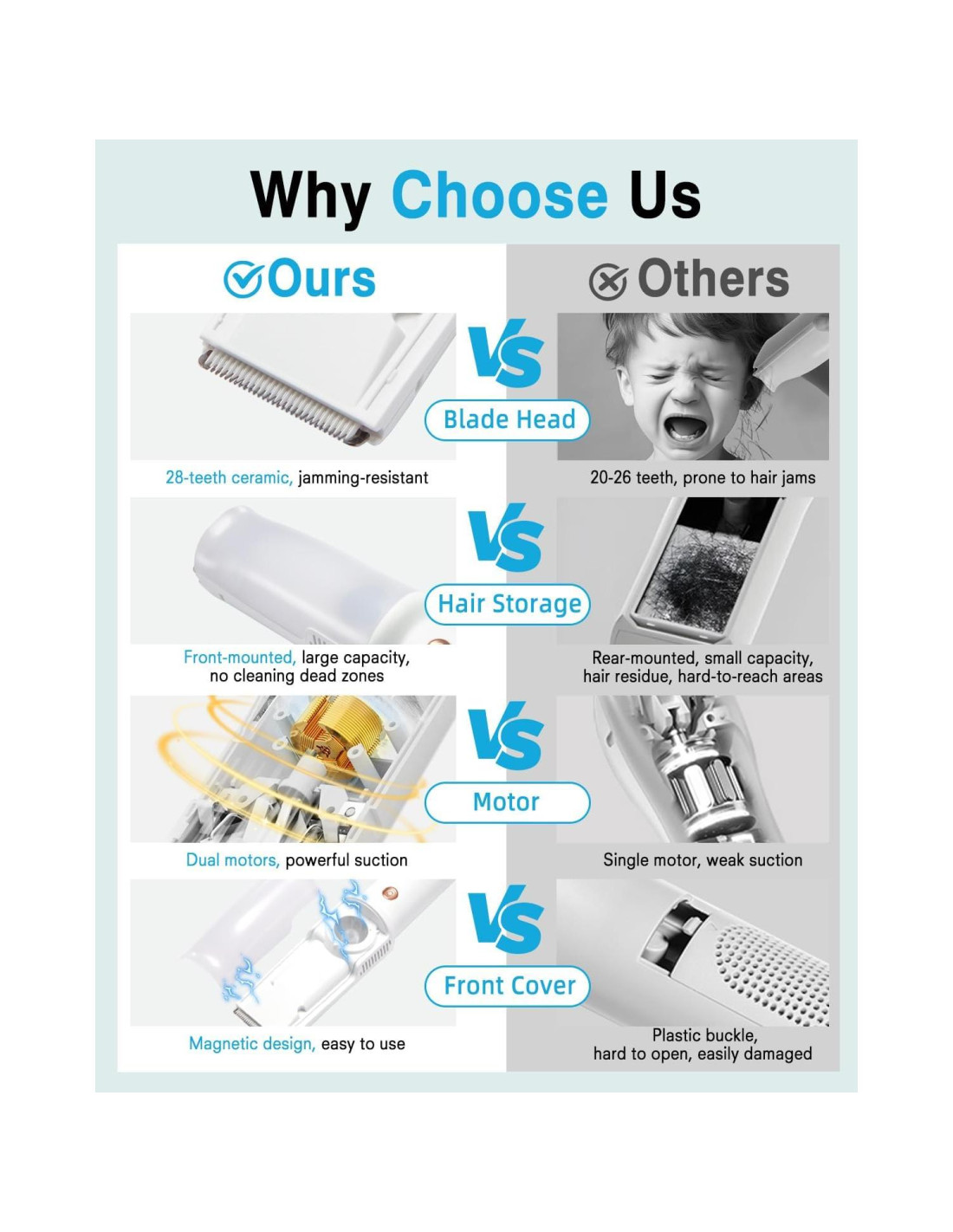 - [Cortes de Cabello Sin Desorden] Con una succión de entrada de aire de >2.7m/s, la cortadora de cabello para bebés tiene una base de aspiradora integrada que recoge eficientemente el cabello durante el recorte. Esto previene que el cabello suelto caiga sobre tu bebé o el área circundante.