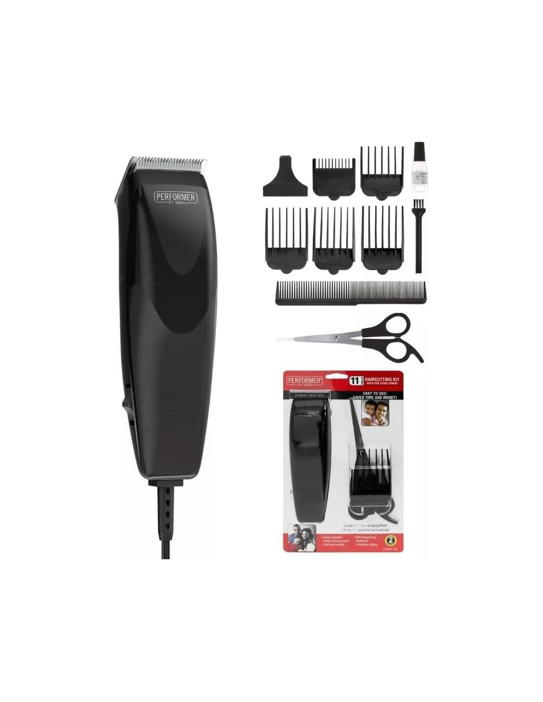 El cortapelos con cable Performer de Wahl es la solución perfecta para cortes y recortes de cabello en casa. Con un diseño simple que es fácil de usar, este cortapelos viene cargado de características para cubrir tus necesidades de cuidado del cabello. Para cortes de precisión, este juego de cortapelos incluye protectores para mezclar y difuminar, brindándote un mayor control. Las 5 longitudes de protectores también ayudan a crear desde cortes al ras hasta difuminados altos y ajustados 1/8" (3 mm), 1/4" (6 mm), 1/2" (13 mm), 3/4" (19 mm), 1" (25 mm). Este cortapelos Wahl es increíblemente versátil y puede ser utilizado por hombres, mujeres y niños. Para aquellos que buscan simplicidad en los cortapelos, este conjunto es para ti. Tiene un motor potente y duradero para cortes de cabello sin enganches, perfecto para los que lo hacen por sí mismos. Las cuchillas de precisión autofilables se mantienen afiladas por más tiempo en comparación con la competencia. Nunca te quedes sin energía con este cortapelos con cable hecho solo para enchufes de EE. UU.