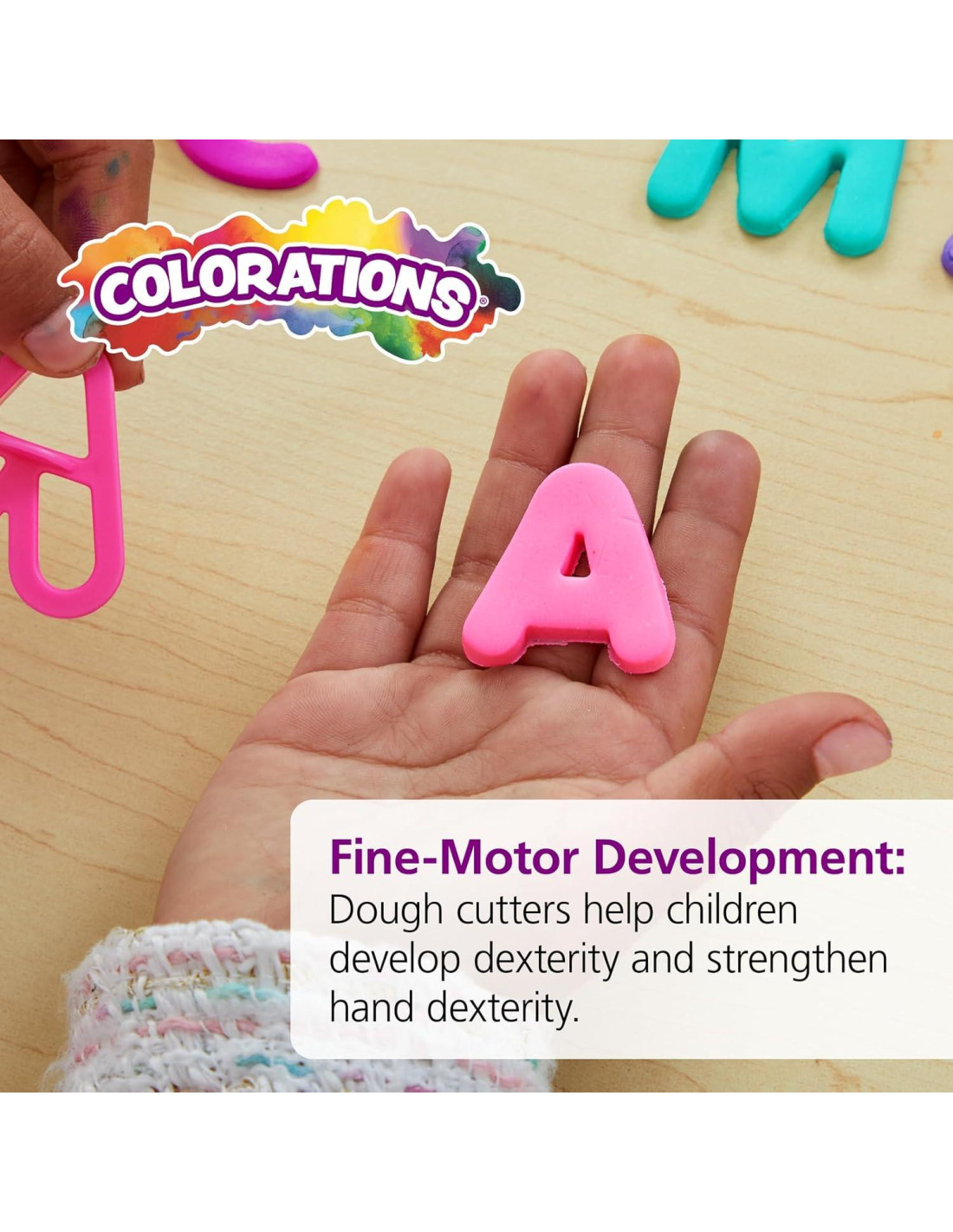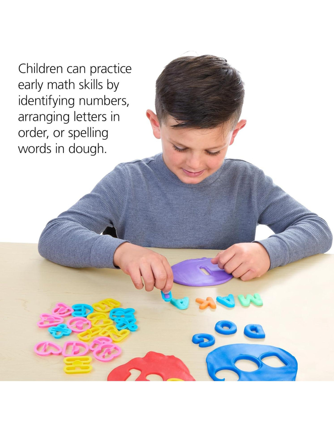 - BENEFICIOS: Los niños pueden practicar habilidades matemáticas tempranas al nombrar cada número, trabajar con el orden de las letras o deletrear palabras en la masa.