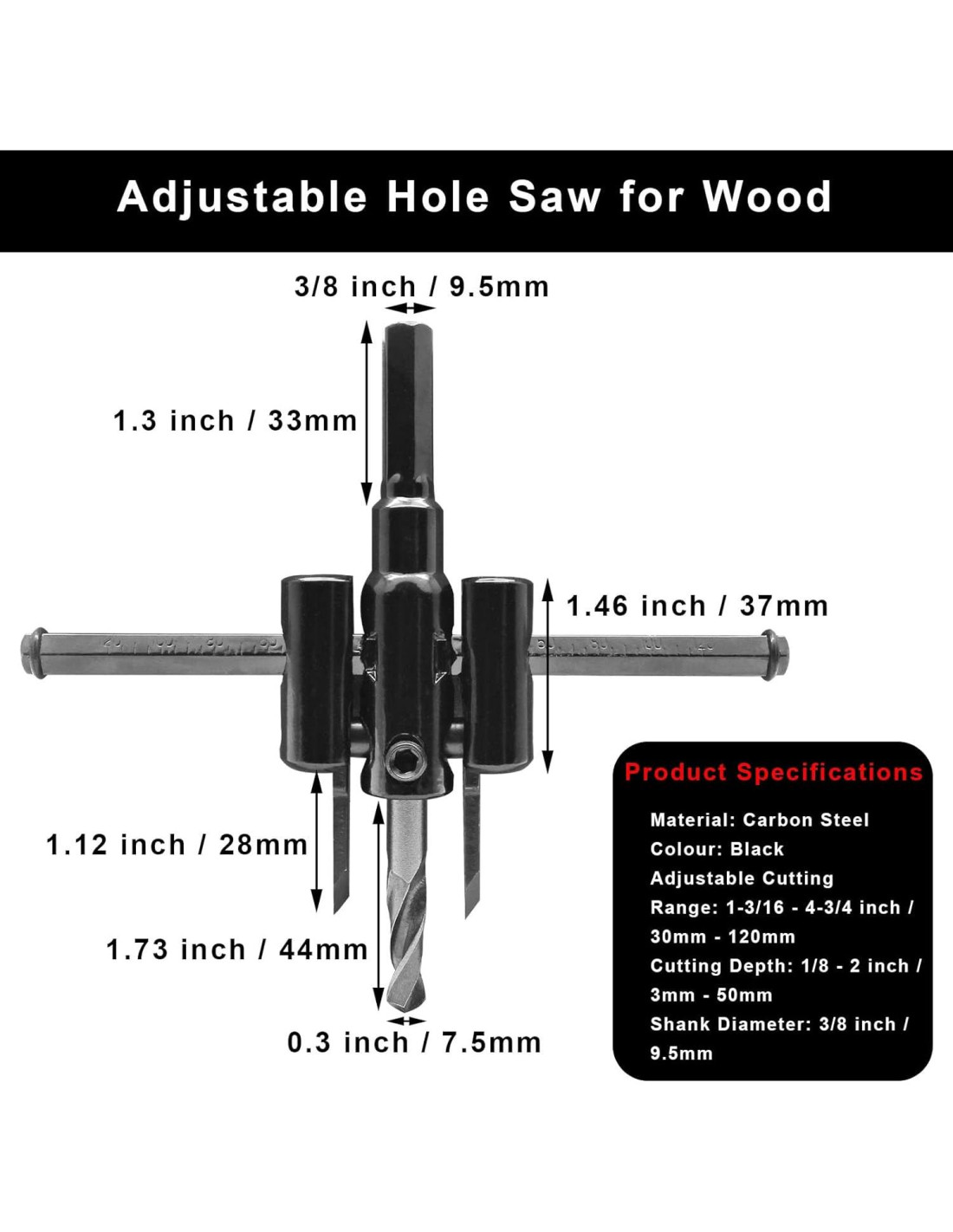 - Contenido del paquete: 1 x Cortador de agujero ajustable, 1 x Broca, 1 x Llave hexagonal, Rango de corte ajustable: 1-3/16 - 4-3/4 pulgadas / 30mm - 120mm, Profundidad de corte: 1/8 - 2 pulgadas / 3mm - 50mm, Diámetro del vástago: 3/8 pulgadas / 9.5mm. La sierra de agujero circular se puede instalar fácilmente en un taladro manual o vertical, Color: Negro.