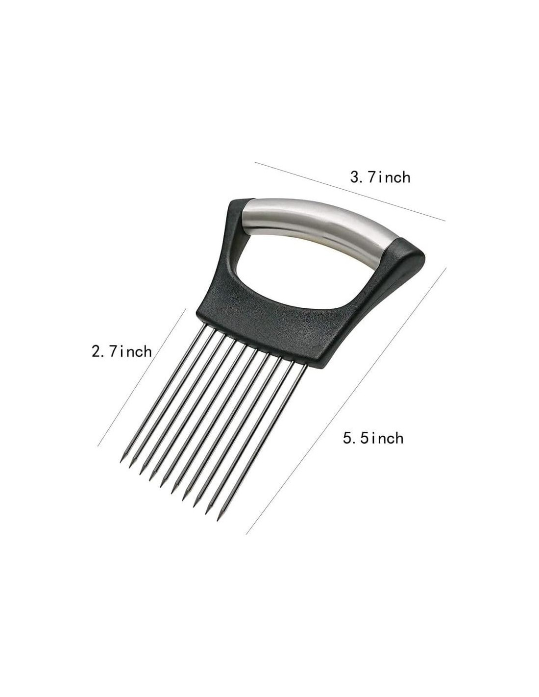 - Cortador de Cebolla: Este cortador cuenta con 10 tenedores de acero inoxidable para mantener las cebollas en su lugar, haciendo que el corte sea rápido y fácil. Incluye un agarre cómodo y un diseño antideslizante para mayor conveniencia.