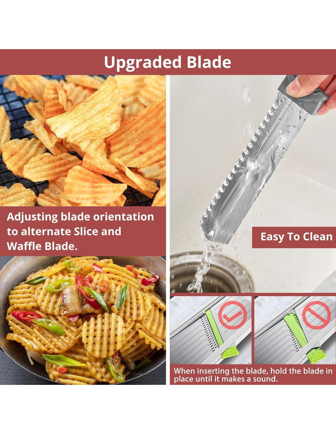 - Característica especial: Cortador de Papas Fritas en Waffle, Antideslizante, Plegable, Cuchilla Removible, Grosor Ajustable