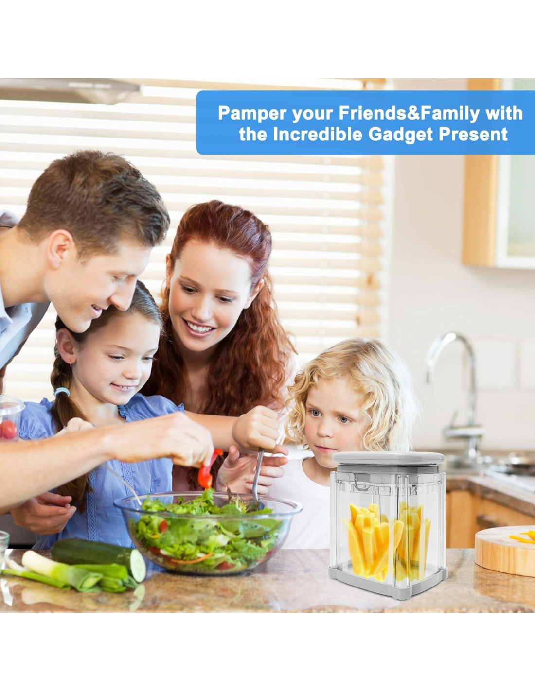- [Ahorra Espacio y Tiempo] Este gadget de cocina compacto que ahorra espacio se almacena fácilmente para su conservación, ya que todas las piezas encajan convenientemente en el contenedor de la Caja de Picado. Con una fácil configuración, uso y limpieza, la Caja de Picado está diseñada para ayudar con el corte, picado y rebanado. Además, con la comodidad adicional de su contenedor, una vez que las frutas y/o verduras han sido cortadas, se pueden transferir fácilmente a una olla o sartén.