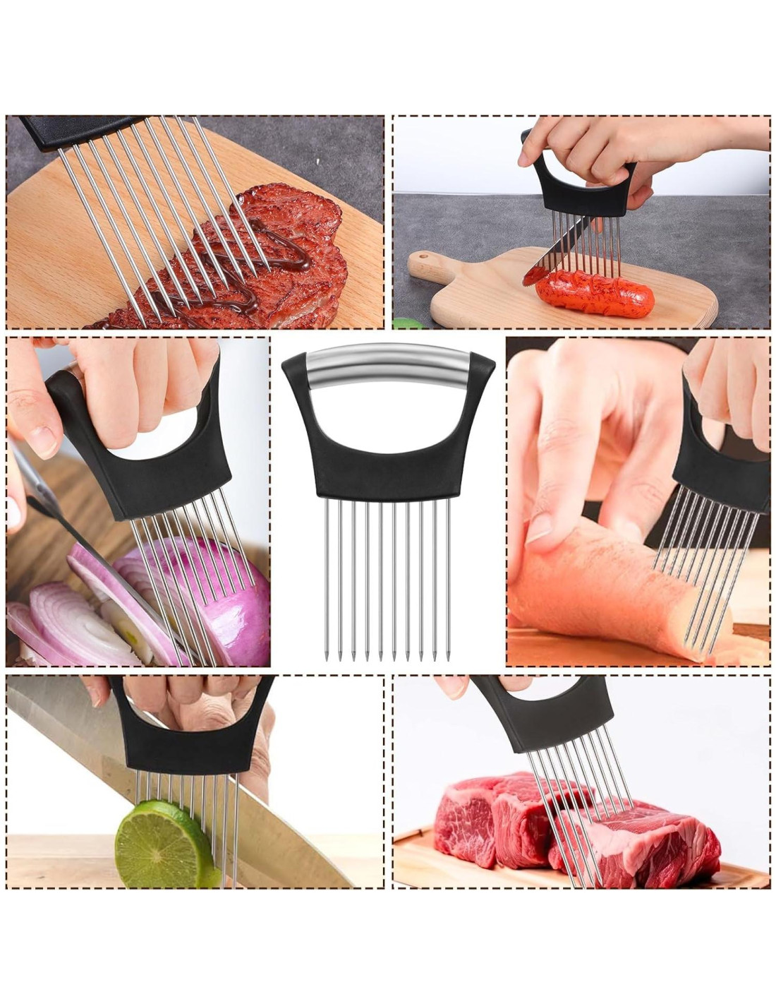 - [Asistente de Cocina Multifuncional] Este cortador de cebolla de acero inoxidable con aguja de carne multifuncional no solo es adecuado para cebollas, sino que también se puede usar para otros ingredientes duros como frutas, zanahorias, limones y ajo. El soporte para cortar manzanas también se puede usar como un ablandador de carne, ya que sus largas agujas de acero penetran profundamente en la carne para realzar su sabor.