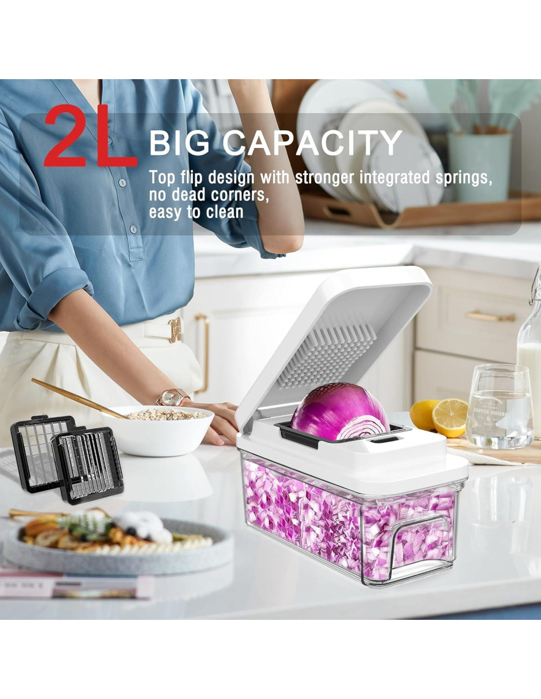 - Cortadora Chopbox de Gran Capacidad de 2 L: La mandolina de CrazyQueen con caja de recolección de verduras de 2 L, diseñada para reuniones familiares y con amigos; Y puede contener múltiples verduras diferentes en una sola caja, como cebolla picada, rebanador de pepinos, cortador de patatas