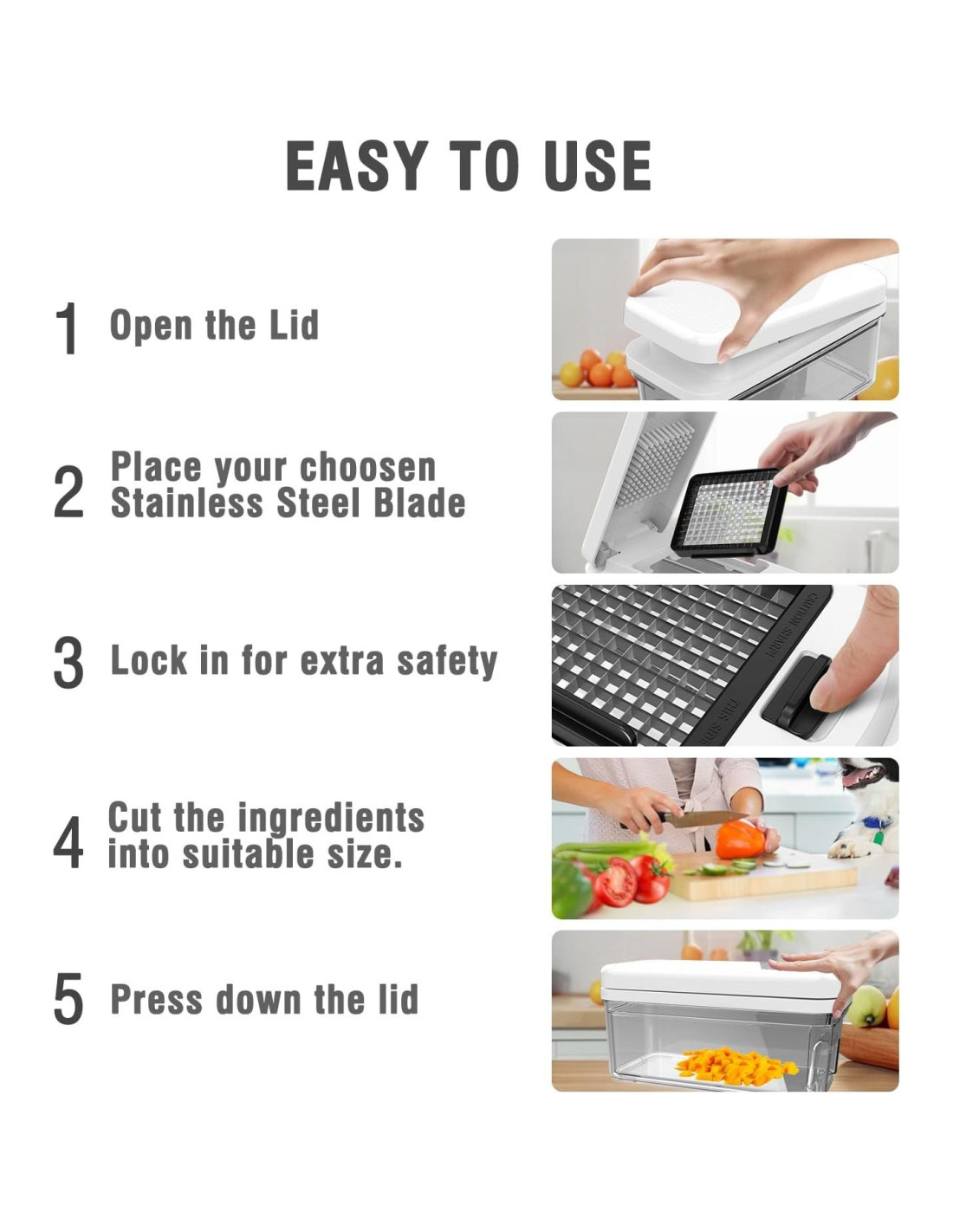 - Por Favor Presta Atención: El cortador de cebolla con cuchillas de acero inoxidable son de alta calidad y extremadamente afiladas; Por favor ten cuidado al usarlas o al cambiar las cuchillas; Adoptar cuchillas de acero inoxidable mantiene la afiladura para un corte limpio y suave