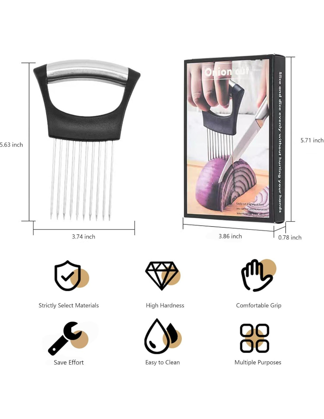 - Ahorro de Tiempo: Diga adiós a los cortes tediosos y que consumen tiempo. Nuestro soporte de cebolla de acero inoxidable está diseñado con puntadas afiladas para prevenir deslizamientos y asegurar cortes uniformes, garantizando mayor seguridad al cortar cebollas, aguacates, huevos y otras verduras